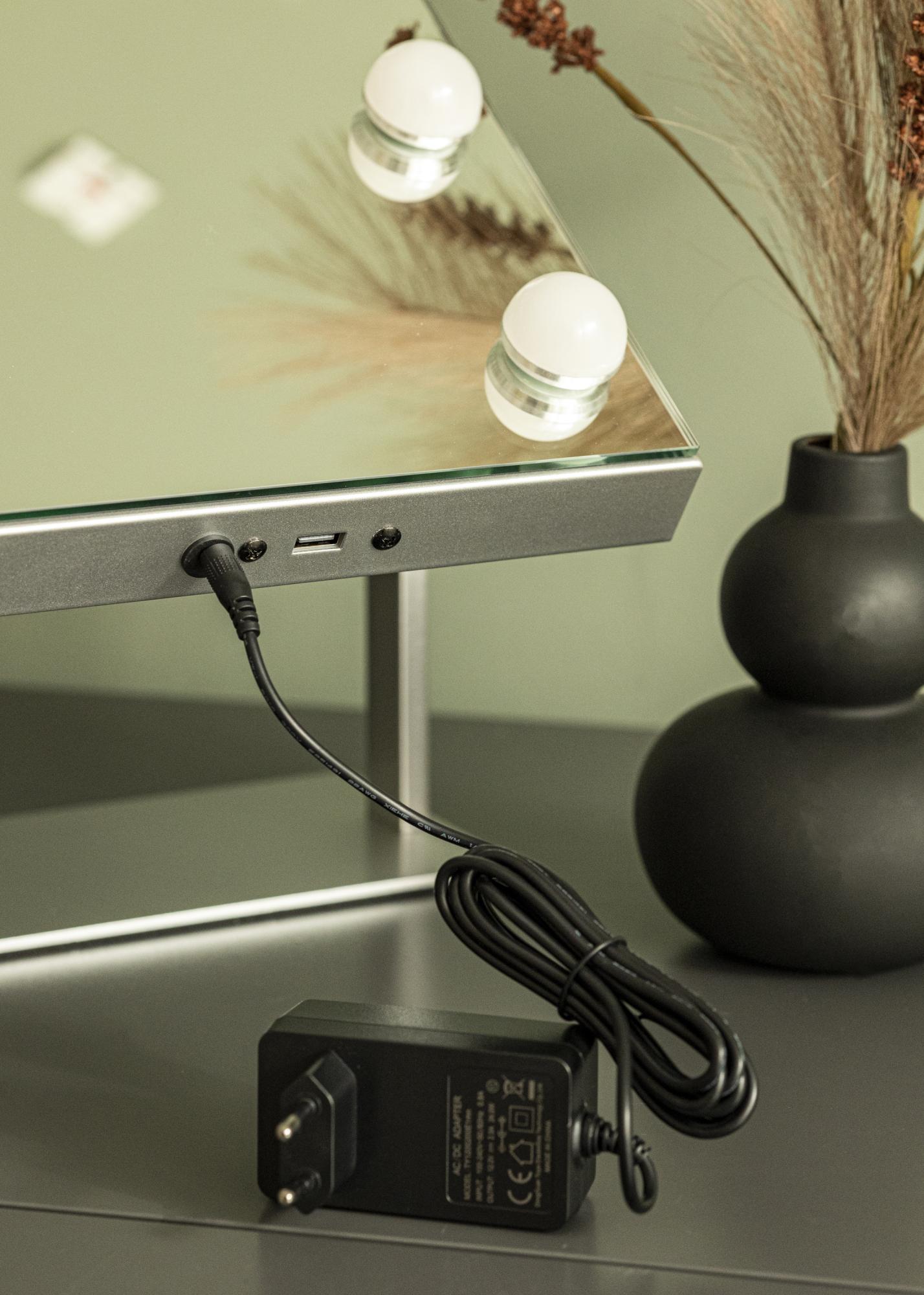 Dieser Spiegel wird mit einem stilvollen, silberfarbenen Standfuß geliefert. Der Spiegel kann im Neigungswinkel verstellt werden. An der unteren Kante des Spiegels befindet sich ein USB-Anschluss zum Aufladen smarter Endgeräte.
