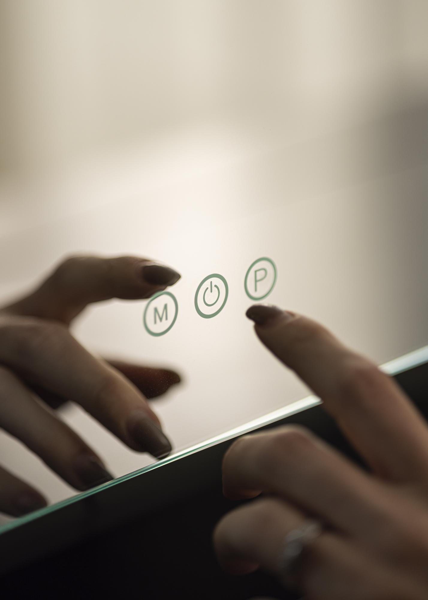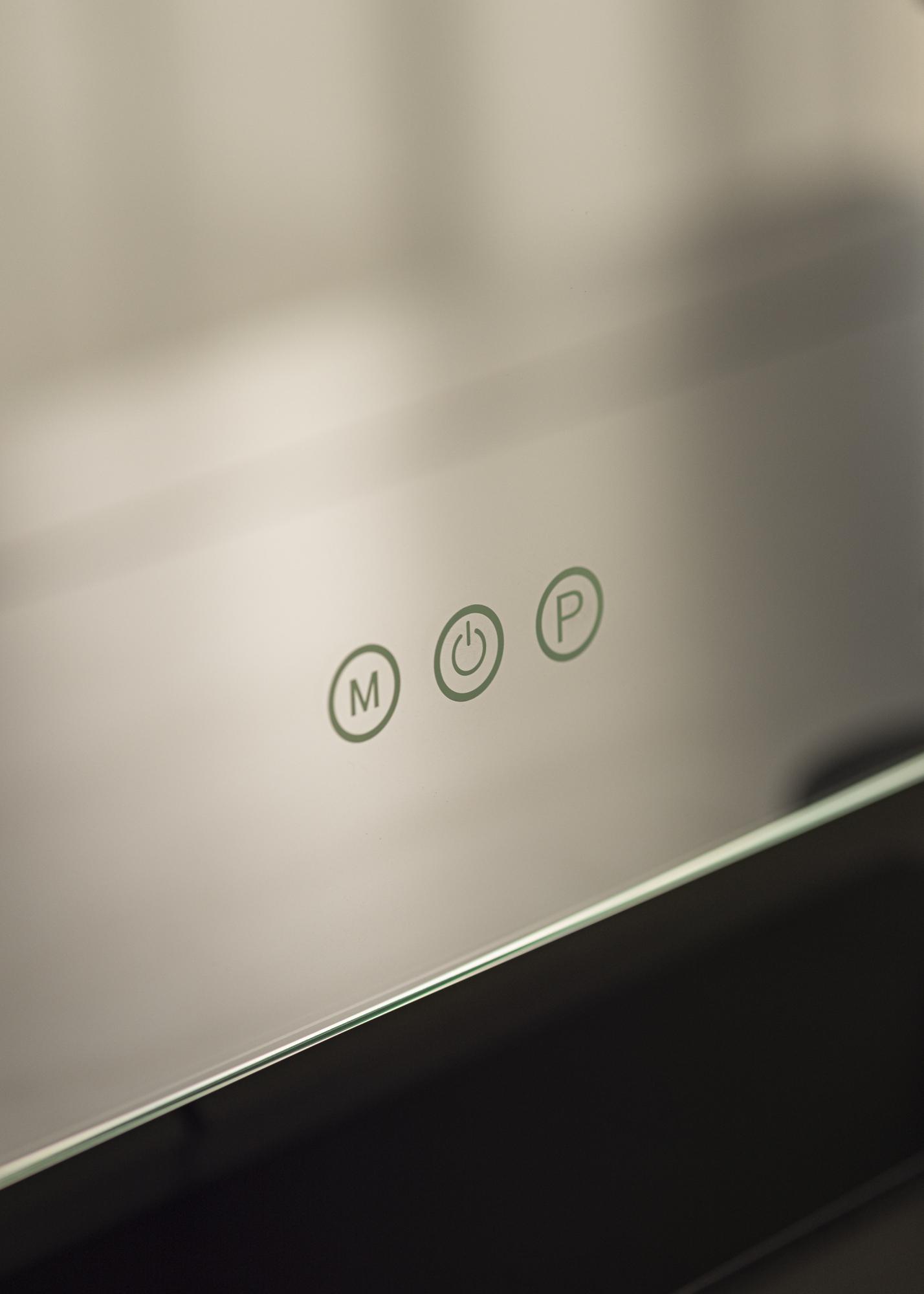 Dieser Schminkspiegel ist mit einem integrierten LED-Band ausgestattet, das die Spiegelfläche oben und an den Seiten hübsch einrahmt. Die LED-Beleuchtung des Spiegels kann einfach mit Hilfe einer Touch-Taste, die mit „P“ gekennzeichnet ist, gedimmt werden. Die Farbtemperatur kann mit der ”M”-Taste eingestellt werden. So können die Einstellungen der Spiegelbeleuchtung einfach und schnell, je nach Wunsch und Bedarf, geändert werden. Ein gedimmtes Licht eignet sich wunderbar als stimmungsvolle Hintergrundbeleuchtung, wohingegen eine höhere Lichtstärke beim Schminken und Auftragen von Make-Up vorteilhaft ist. Eine weitere Toch-Taste zum Ein- und Ausschalten der Spiegelbeleuchtung ist ebenfalls vorhanden. Der Stromanschluss des LED-Spiegels erfolgt über einen Stecker.