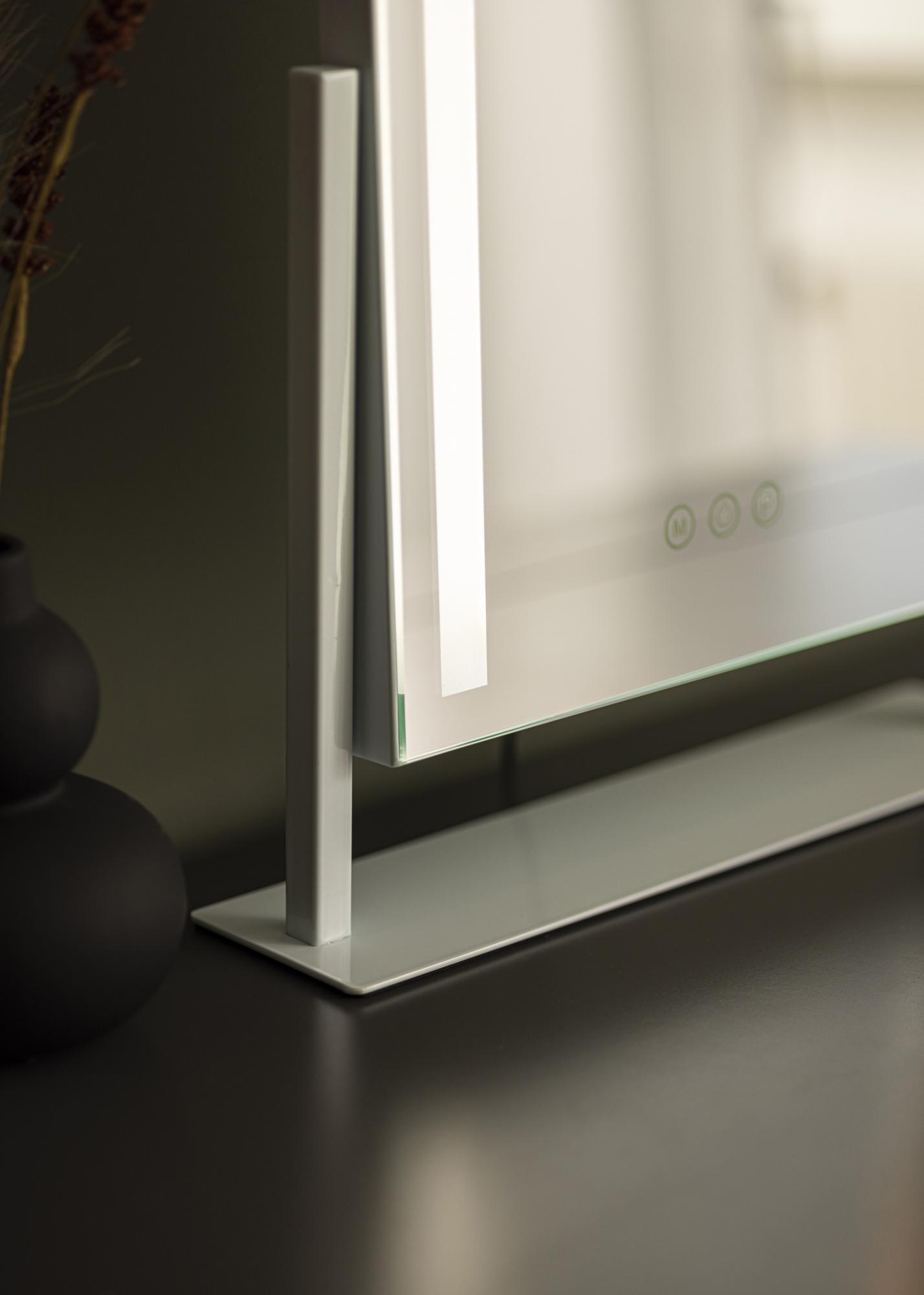 Dieser Spiegel mit Beleuchtung besitzt einen Standfuß aus Metall in elegant weißer Farbe, die dem gesamten Spiegel einen stilsicheren, ansprechenden Charakter verleiht. Dank des kompakten Spiegelformats, die Größe der Spiegelfläche beträgt 30x41 cm, findet dieser Schminkspiegel auf nahezu jedem Tisch, sei es Schminktisch, Esstisch oder Beistelltisch, Platz, sei es in Wohnzimmer, Schlafzimmer oder im Flur. Das clevere Design dieses LED-Kosmetikspiegels erlaubt auch ein Verstellen des Neigungswinkels. Der Spiegel mit integrierter LED-Beleuchtung wird über einen Stecker an den Strom angeschlossen.