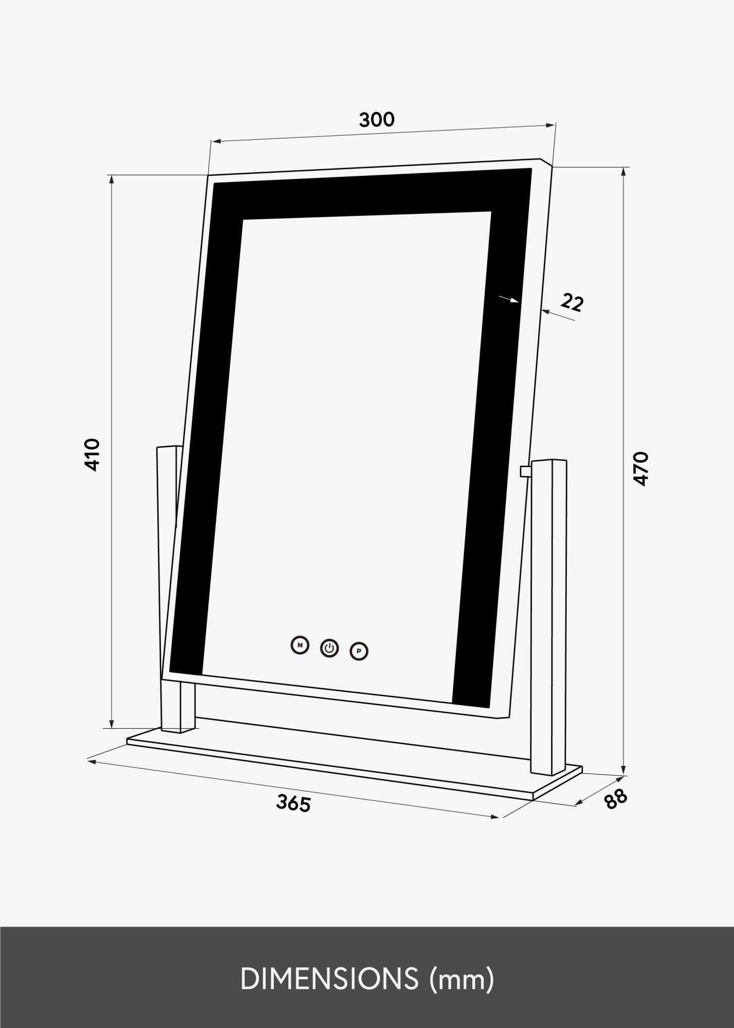 Dieser LED-Spiegel ist eine gute Wahl für alle, die nach einem eleganten Schminkspiegel mit integrierter Beleuchtung suchen. Die Beleuchtung dieses Kosmetikspiegels besteht aus einer Art Leuchtband, das die Spiegelfläche dekorativ einrahmt und sich durch einen gleichmäßigen Lichtschein auszeichnet. Optimal, um sich beim Schminken etc. bestens betrachten zu können. Auf der Vorderseite des Spiegels befinden sich drei Touch-Tasten, womit die Spiegelbeleuchtung ein- und ausgeschaltet, die Farbtemperatur zwischen warmweiß, kaltweiß und natürlichem Licht ausgewählt und das Licht gedimmt werden kann. Damit kann die Beleuchtung des Spiegels je nach Wunsch, Bedarf und Situation angepasst werden. Mit der Taste, die mit "M"-gekennzeichnet ist, wird die Farbtemperatur gewählt und mit der "P"-Taste wird die Lichtstärke eingestellt.