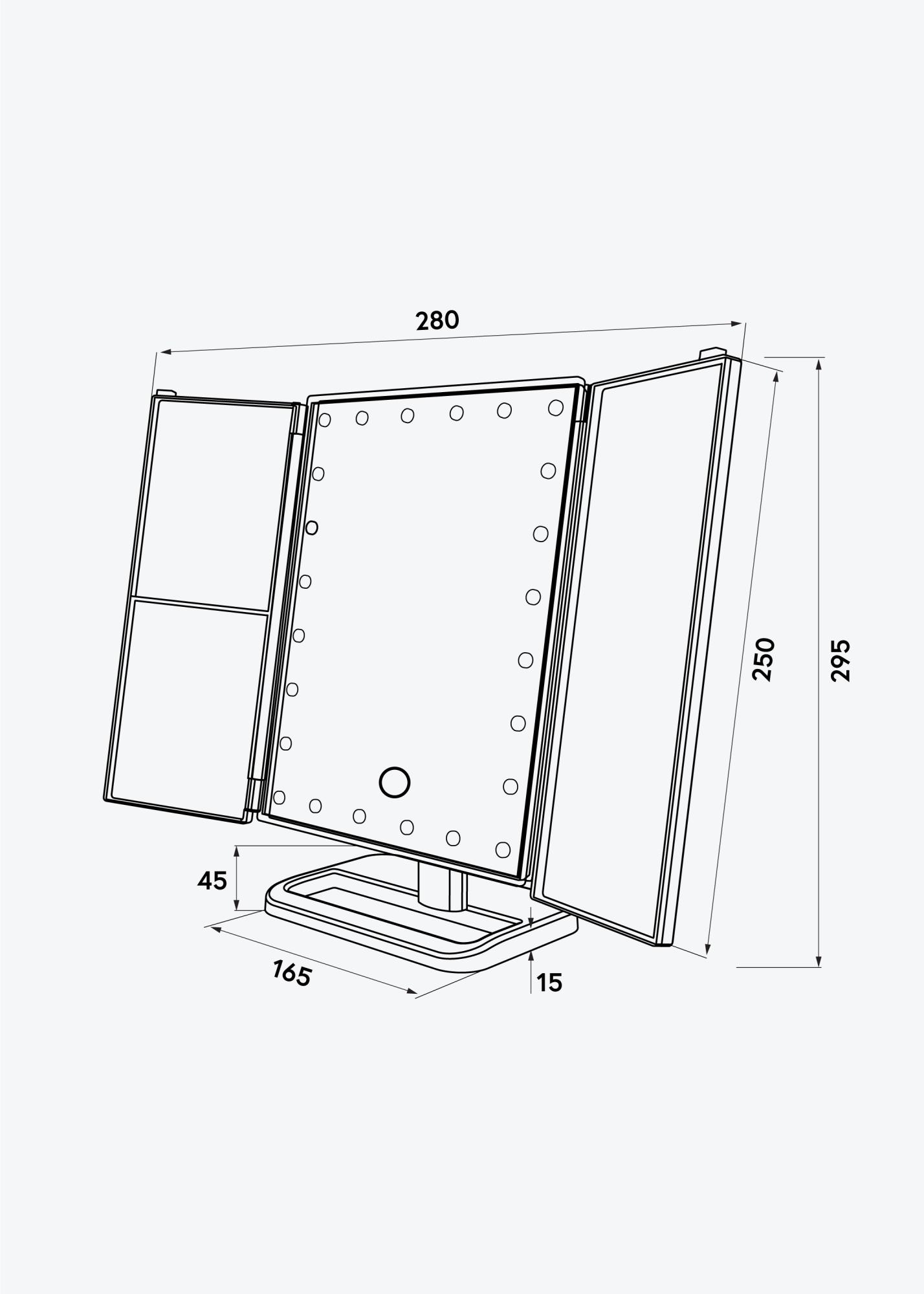 Das clevere Design dieses Spiegels ermöglicht das Einklappen der Seitenteile. Dadurch kann der Schminkspiegel auch im Winkel verstellt werden, was beim Auftragen von Schminke und Make-Up zweifellos vorteilhaft sein kann. Die große Spiegelfläche ist mit normalem Spiegelglas versehen und die kleineren Spiegelflächen bieten eine 2-fach, 3-fach und 10-fach Vergrößerung. Ausgesprochen praktisch, um eine kleinere Gesichtspartie ganz genau im Blick zu haben.
