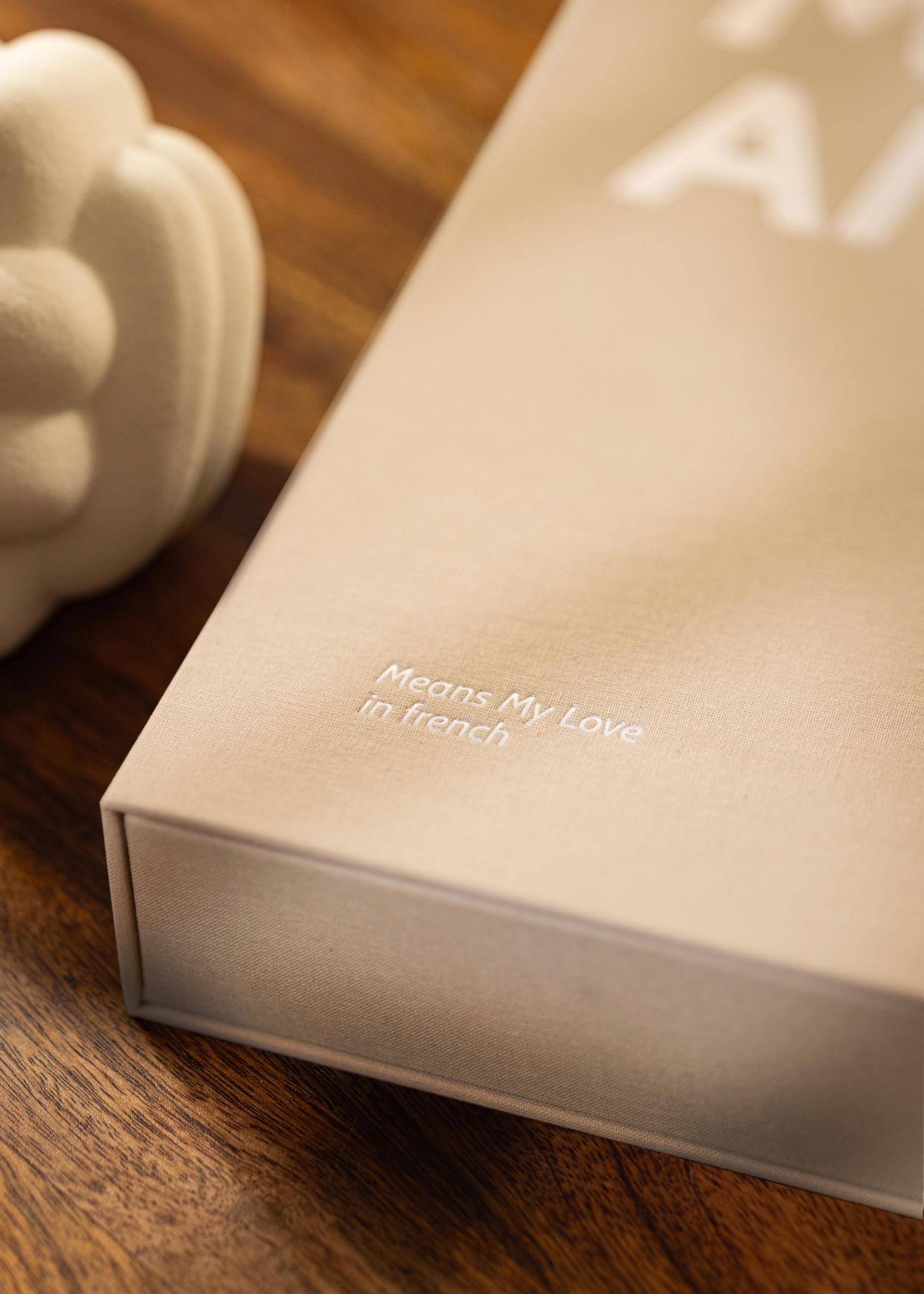 Bist du auf der Suche nach einem modernen, stilvollen Fotoalbum, das nicht in einer Schublade verschwinden soll, sondern in deiner Wohneinrichtung einen kleinen, feinen und vor allem eleganten Akzent setzt? Dann dürfte dieses Coffee Table Album das Richtige sein. Dieses Fotoalbum ist wie eine Box designt und zeichnet sich durch den stilsicheren Textileinband in grau-beiger Farbnuance aus. Der Albumtitelprint ”MON AMOUR” verleiht dem Fotoalbum einen romantischen Charakter, der einen schönen Kontrast zu dem ansonsten eher minimalistischen, schlicht gehaltenen Design des Fotoalbums bildet. Der Untertitel auf der Vorderseite links unten lautet ”Means My Love in French”.