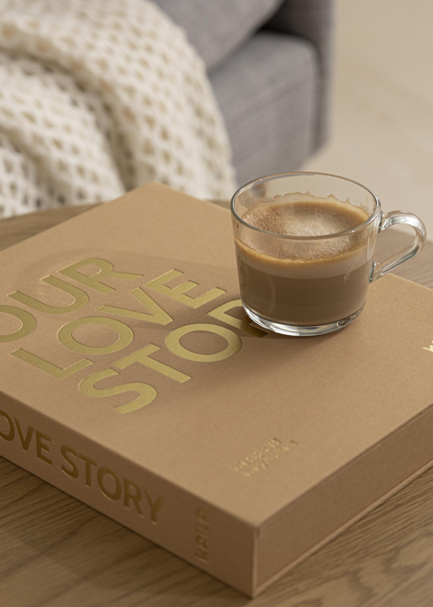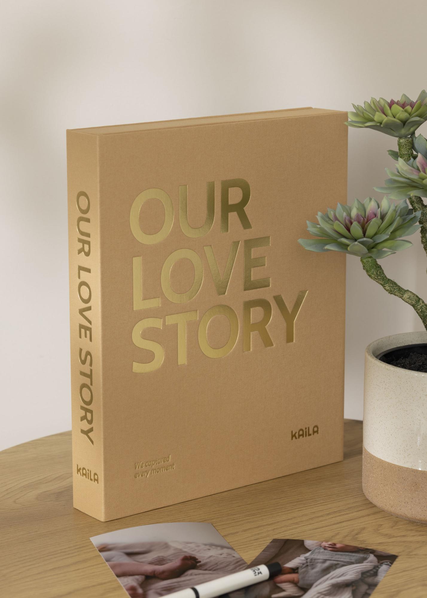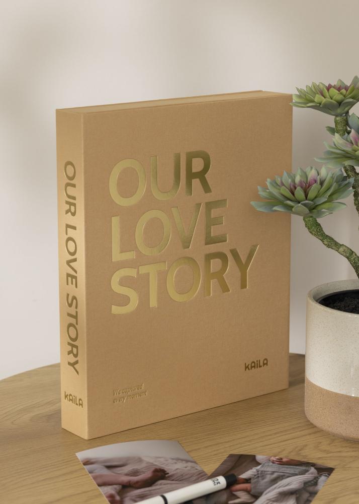 Ausgesuchtes Fotoalbum und Coffee Table Book in einem, das sich auch als dekoratives Einrichtungsdetail sehen lassen kann! Ein edles Fotoalbum mit Textileinband in Form einer eleganten Box. Schöner, geschmackvoller Manila-Farbton. Das Fotoalbum trägt den Titel ”OUR LOVE STORY”, gedruckt in goldenen Großbuchstaben, sowie den Untertitel ”We captured every moment”. Damit ist dieses Fotoalbum wunderbar geeignet, deine liebsten Foto-Erinnerungen von z.B. Freundschaften und Beziehungen aufzubewahren, und es passt auch ganz hervorragend als persönliches, stilvolles Fotogeschenk. Beispielsweise ist dieses elegante, ansprechende Fotoalbum prima als Hochzeitsalbum für Hochzeitsfotos geeignet. Für einen selbst oder als zusätzliches, nachträgliches Hochzeitsgeschenk. Auf der Innenseite des Einbandes findest du ein diskret gedrucktes Muster und ein Ringbuch mit 30 schwarzen Albumblättern (60 Seiten), um deine Fotos selbst einzukleben. Das Fotoalbum zum Einkleben lässt dabei genügend Raum für persönliche Gestaltung und Kreativität.