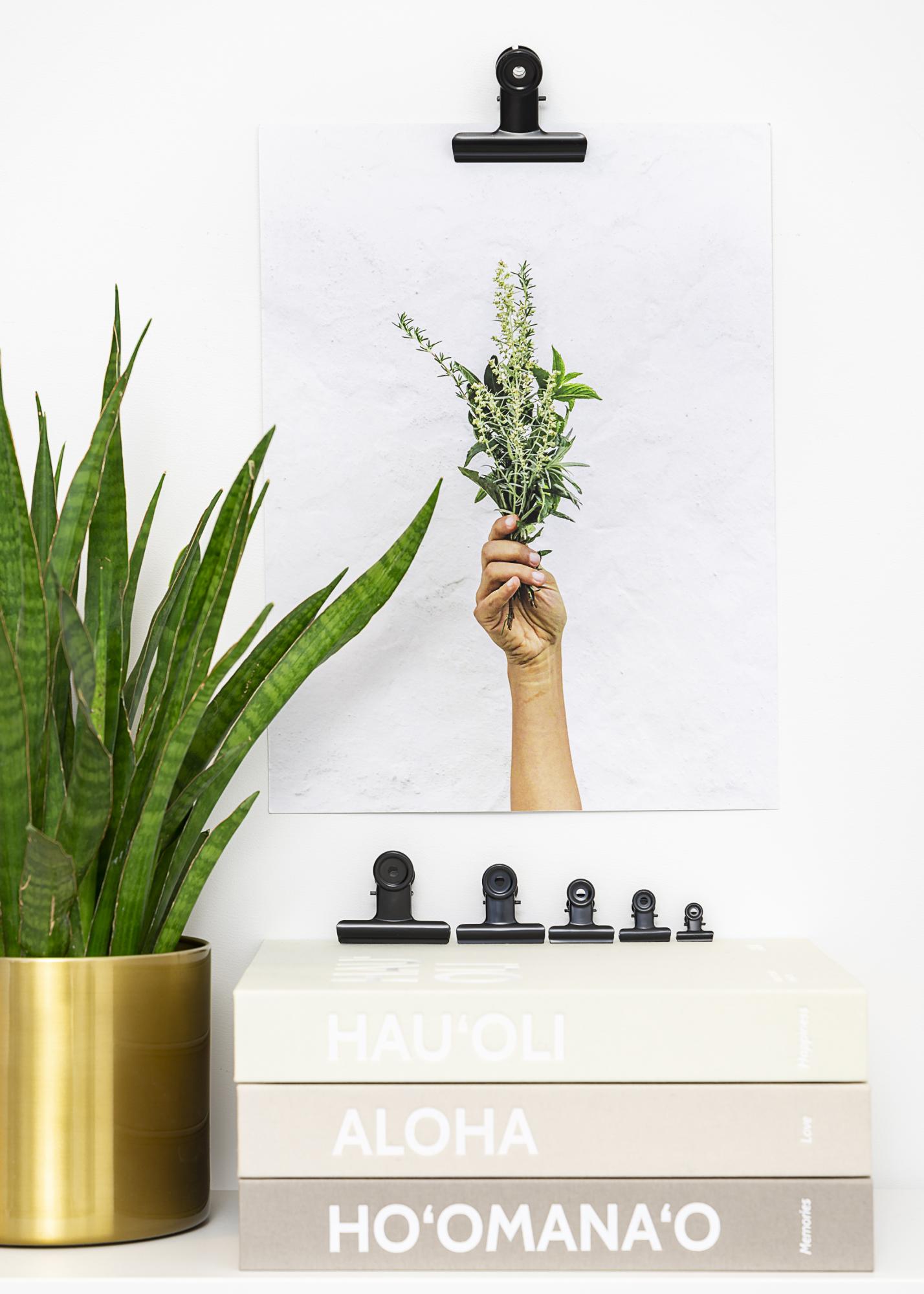 Posterclip schwarz mit mattem Finish. Diese hübsche Papierklammer eignet sich für das Aufhängen von Postern und Drucken. Chic und trendy Poster Aufhängeklemme, die stark genug ist, auch dünnes Papier zuverlässig festzuhalten. Bei großen Postern empfiehlt es sich, zwei oder mehr Posterklammern zu verwenden. Das hübsche, stilvolle Design zeichnet diese Posterclips aus. Die Löcher in den runden Enden der Clips machen die Befestigung an der Wand mit Hilfe einer kleinen Schraube oder eines Nagels sehr einfach.