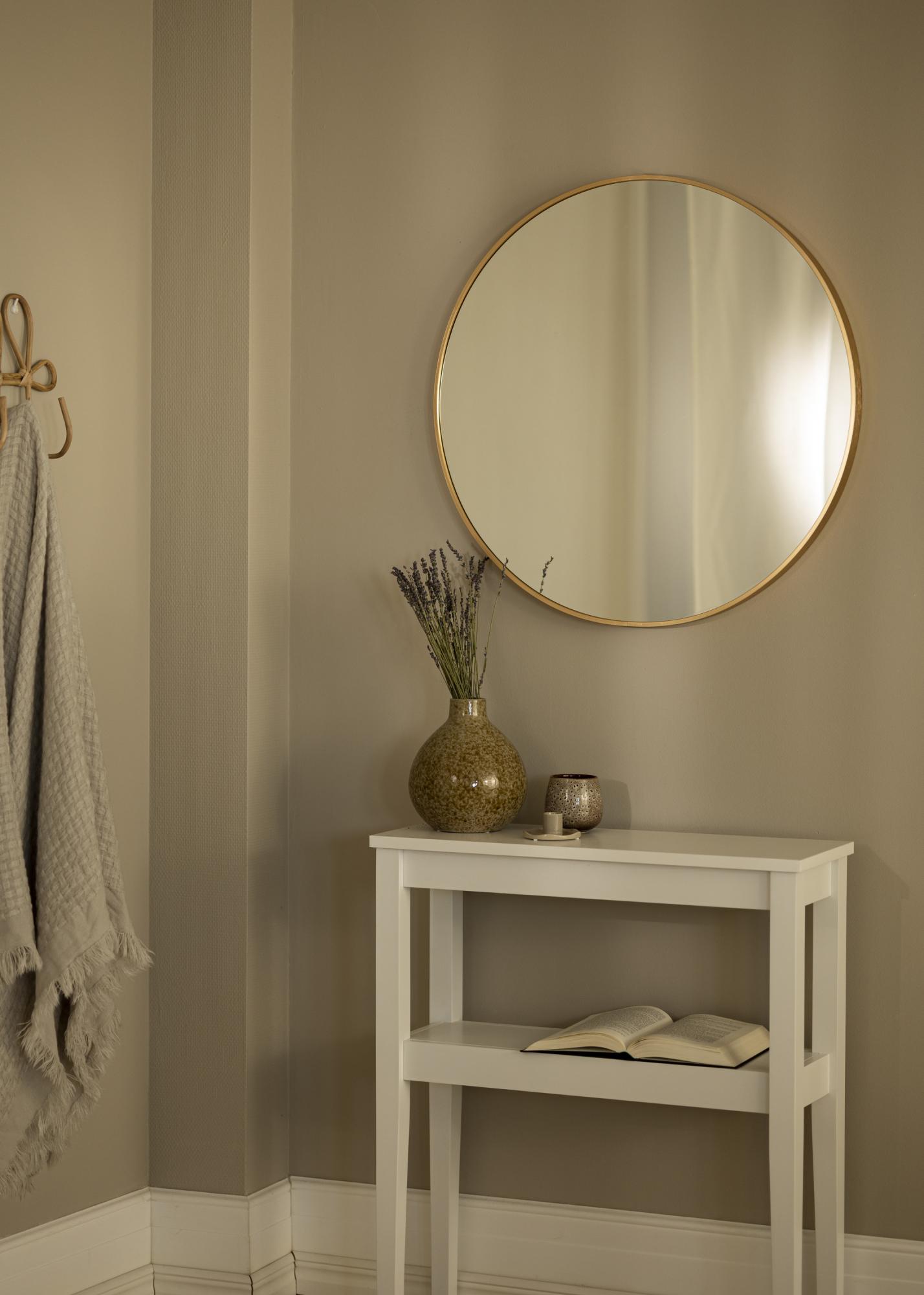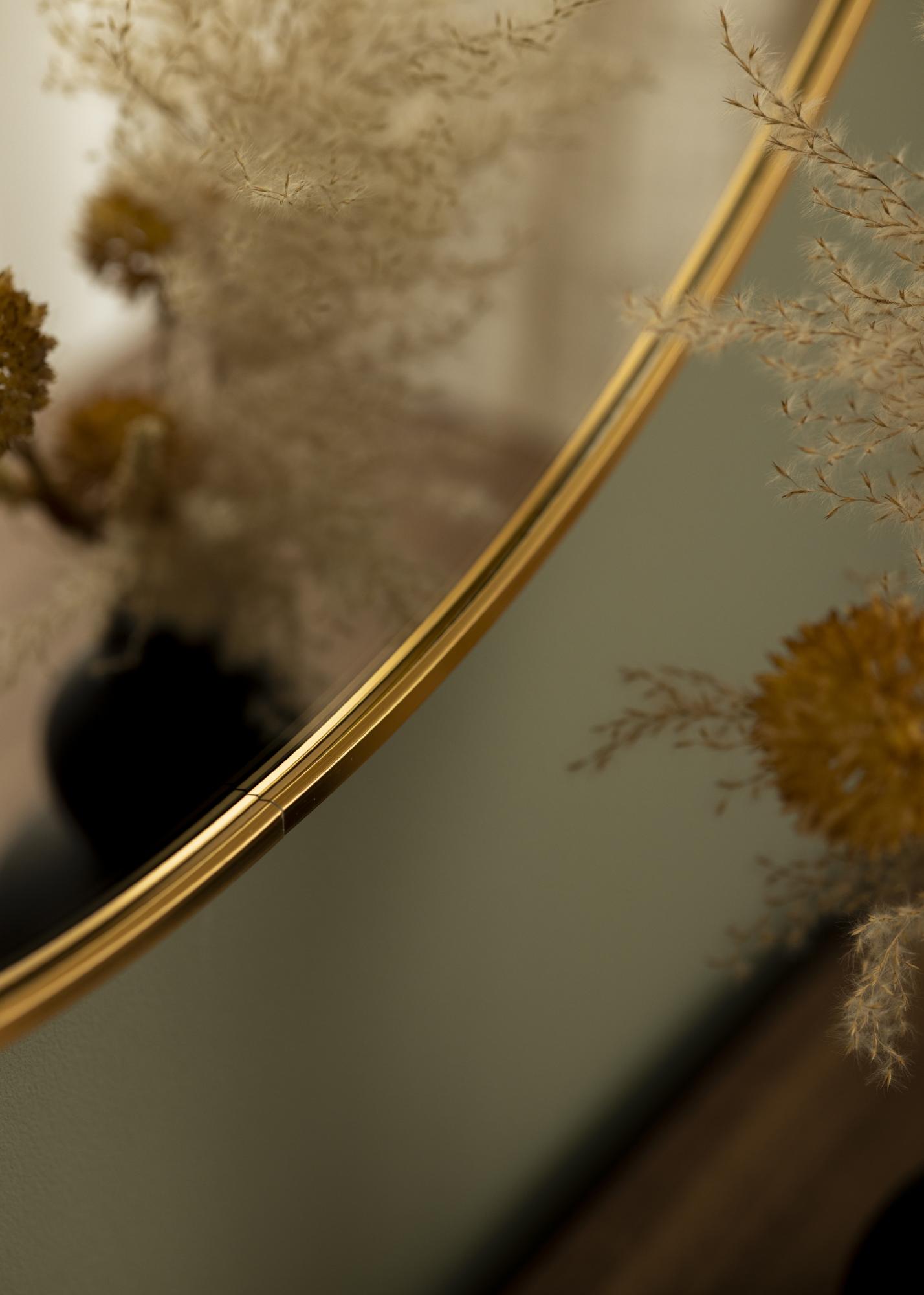 Ein runder Spiegel in stilvollem schwedischen Design mit einem Metallrahmen mit wunderschönem Gold-Finish. Die gebürstete Oberfläche des Rahmens lässt die schöne Goldfarbe etwas matter aussehen. Der Rahmen ist dünn und liegt damit voll im Trend, hat aber gleichzeitig - je nach Größe - eine Tiefe zwischen 30 und 40 mm, sodass er etwas aus der Wand herausragt und einen coolen 3D-Effekt erzeugt. Durch die Tiefe des Rahmens wirkt der Spiegel robust und behält gleichzeitig sein minimalistisches Erscheinungsbild bei.