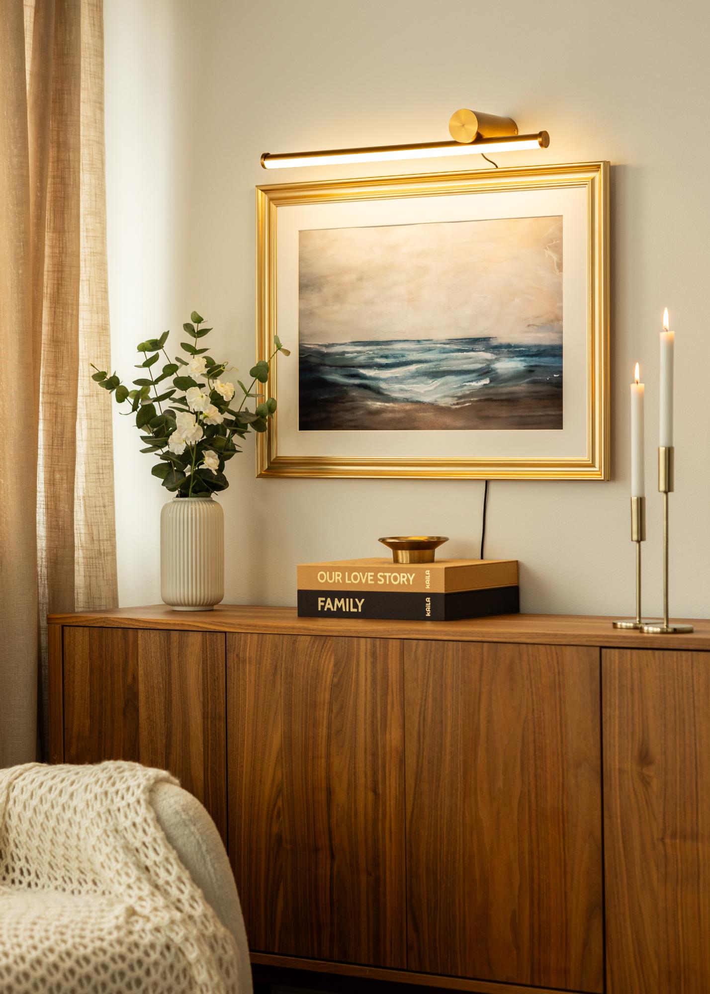 Die Lichtquelle besteht aus einer LED-Beleuchtung, die ein warmweißes Licht mit einer Farbtemperatur von 3000K bietet. Dies bedeutet, dass das Licht angenehm ist und eine einladende Atmosphäre schafft, ohne zu stark zu sein. Die Lichtstärke beträgt 780 Lumen, was ein angemessen starkes Licht bietet, um Ihre Bilder zu betonen, ohne den Raum zu überwältigen. Das Licht wird gleichmäßig über die Fläche verteilt, sodass alle Details des Kunstwerks auf natürliche Weise hervortreten.