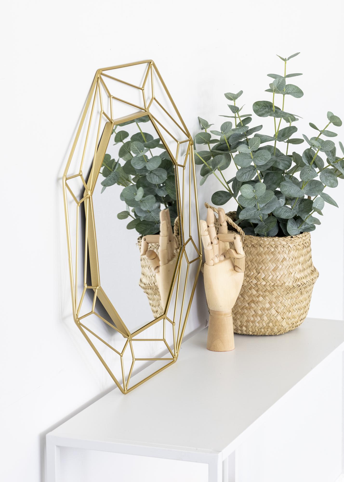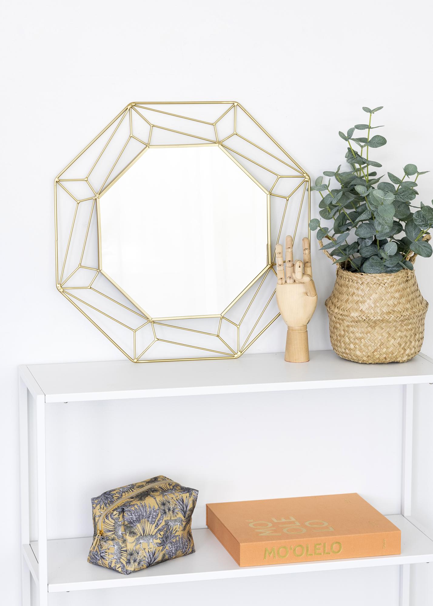 Dieser elegante, kantige, goldfarbene Spiegel mit abstraktem Muster überzeugt durch sein eigenes, edles Design von KAILA. Um die in der Mitte liegende hexagonförmige Spiegelfläche verläuft ein Rahmen aus messingfarbenem Metall, der ein auffallendes, apartes, kantiges Muster bildet. Die goldfarbene Nuance trägt zu dem eleganten, erlesenen Ausdruck dieses Deko-Spiegels bei, der besonders gut zu jeder Einrichtung, die Wert auf Stil und Eleganz legt, passt. Der Wandspiegel misst 50x50 cm und ist aus Metall gefertigt. Auf der Rückseite des Spiegels befinden sich Wandhalterungen zur Aufhängung.