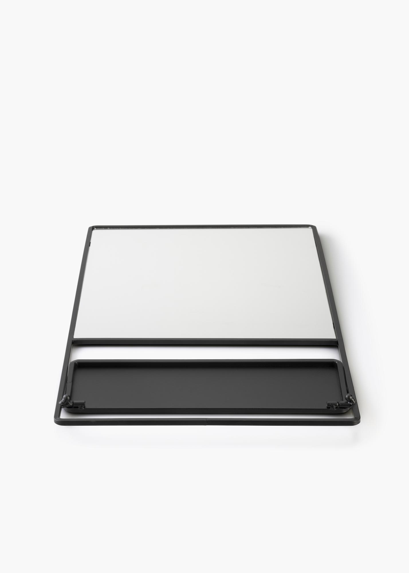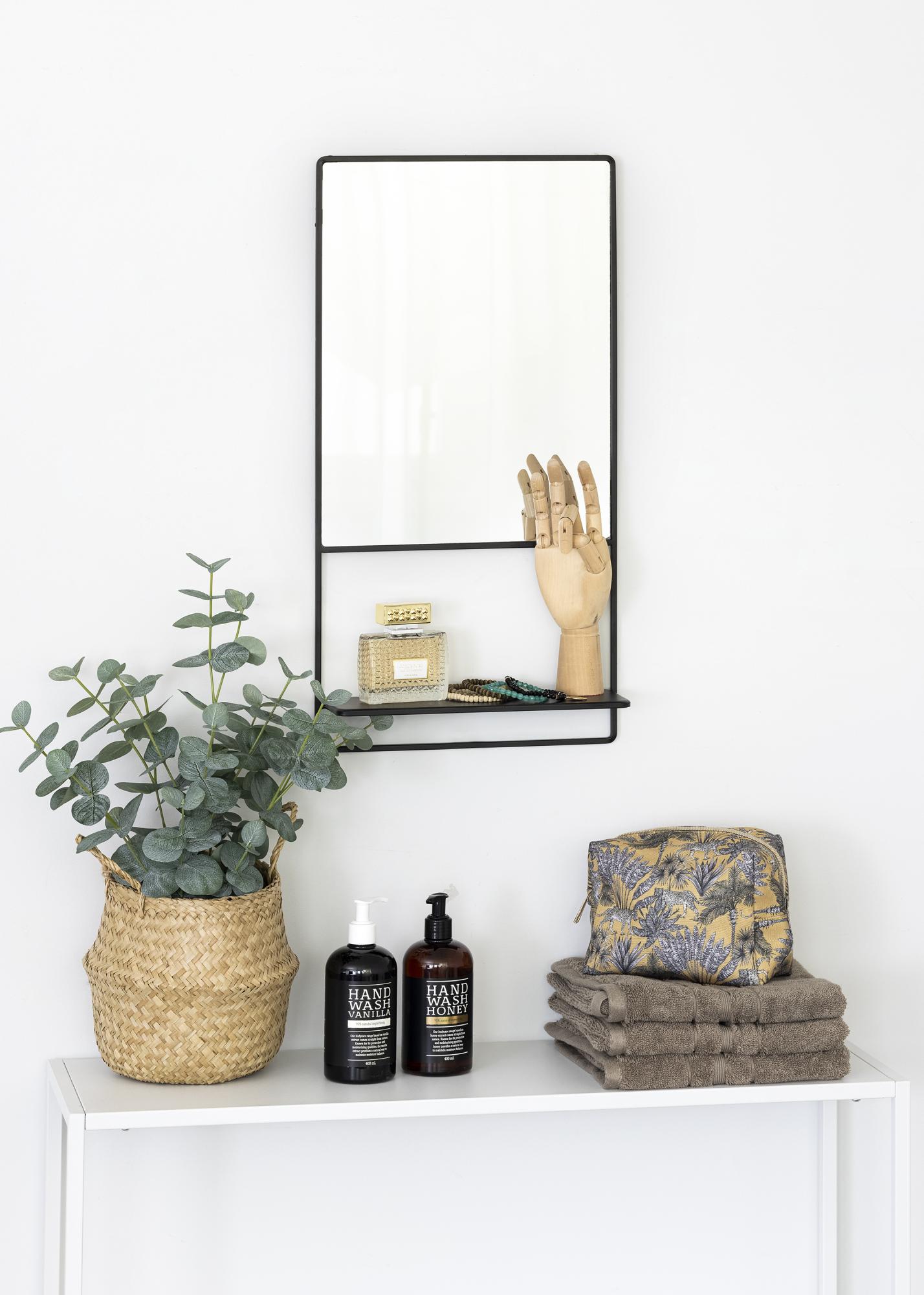 Dieser hübsche, schlichte Wandspiegl mit Ablage überzeugt durch sein einfaches, funktionelles und doch sehr ansprechendes Design von KAILA. Der Spiegelrahmen in der stilsicheren, schwarzen Farbnuance ist aus Metall gefertigt. Die Spiegelfläche selbst ist rechteckig und wird von dem dunklen Rahmen hübsch eingefasst. Etwas über dem unteren Spiegelrand befindet sich die Regalfläche, die sich prima als Ablage- und Aufbewahrungsort für kleine Dinge, Dekogegenstände, Schminksachen etc. eignet. Der Spiegel ist mit einer Wandhalterung ausgestattet, die Größe des Spiegels beträgt 31x60 cm.