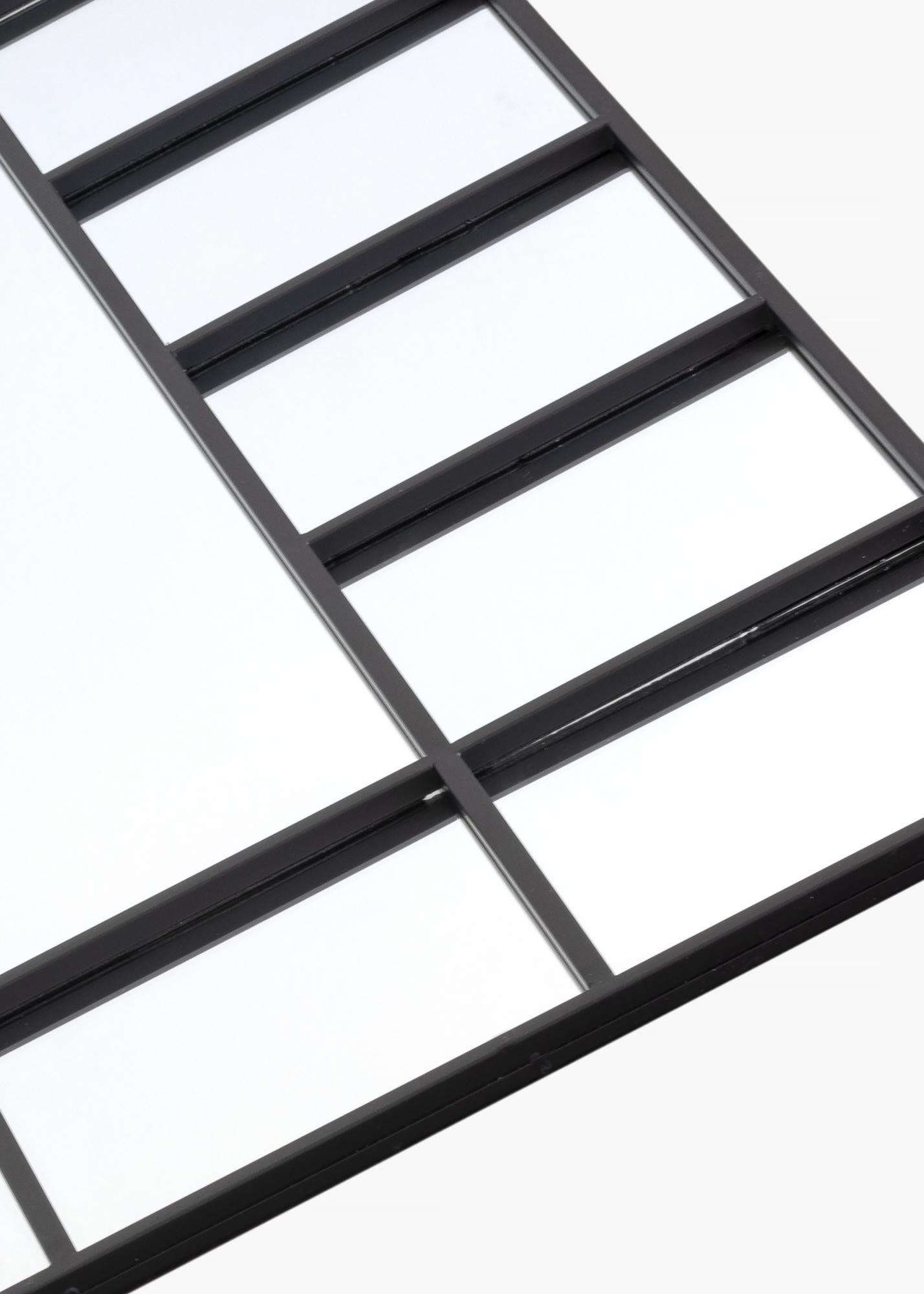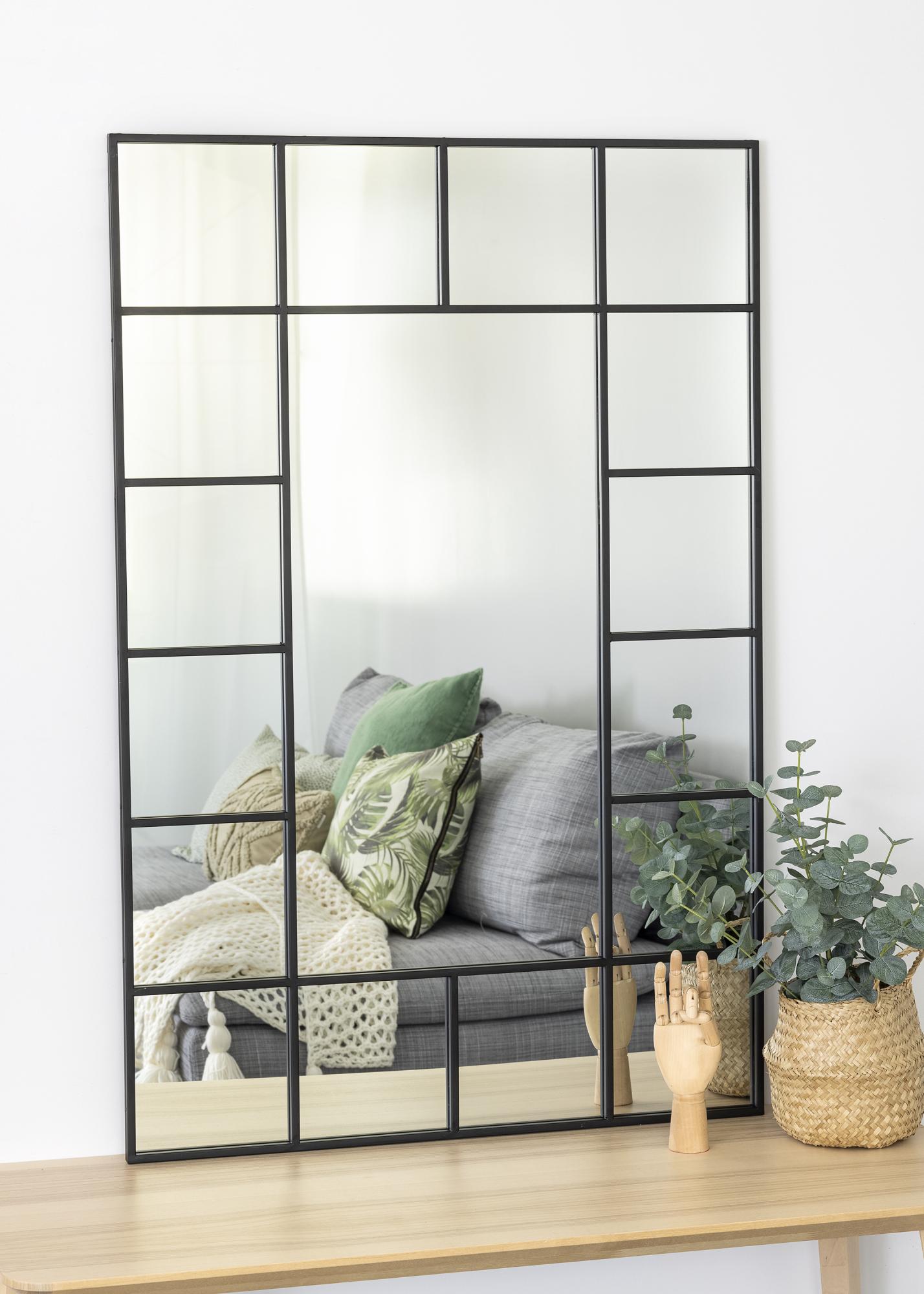 Toller Wandspiegel von KAILA in Fensteroptik. Dieser schöne Deko-Spiegel erinnert an eine elegante Fensterwand als Spiegelfenster. Die kleineren Sektionen des Wandspiegels rahmen die größere Spiegelfläche in der Mitte hübsch ein, die schmalen, schwarzen Linien aus Metall sorgen hierbei für einen industriellen Look mit gleichzeitig elegantem, stilvollem Charakter. Der Dekospiegel ist mit einer Wandhalterung ausgestattet. Der Spiegel kann jedoch auch an die Wand gelehnt aufgestellt werden. Die Größe des Dekospiegels beträgt 80x120 cm.