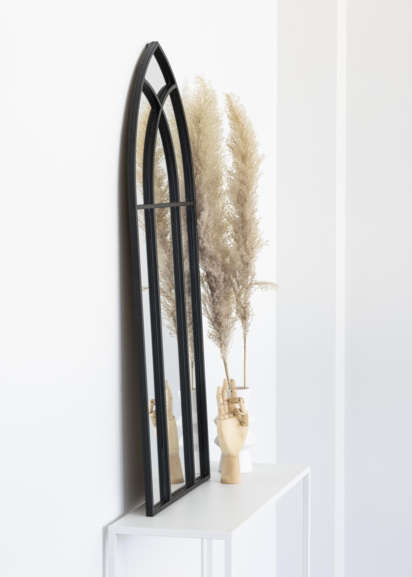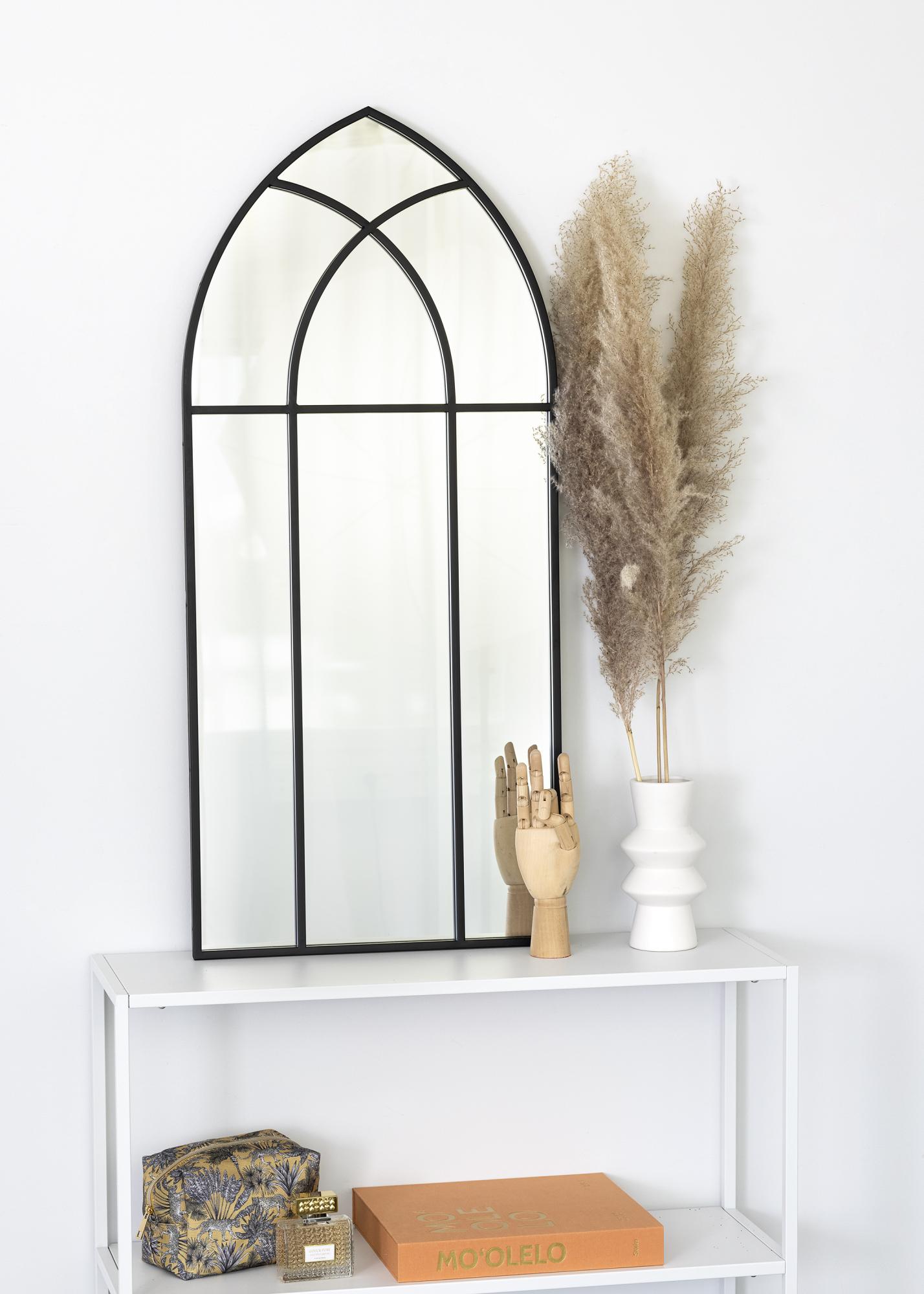 Ein wirklich sehr schöner, dekorativer Wandspiegel in Fensteroptik, der sofort jedem Raum eine romantische Atmosphäre verleiht. Der Dekospiegel erinnert in seiner Formgebung an eine Art Gartenfenster mit Charakter, inspiriert von antikem, gotischem Stil. Die ansprechende Form dieser besonders hübschen Spiegelfensterwand wird sicherlich zu einem Blickfang in deinem Zuhause! Der Dekospiegel besitzt die Größe 45x100 cm und zeichnet sich durch das dekorative Linien-Muster aus Metall aus.