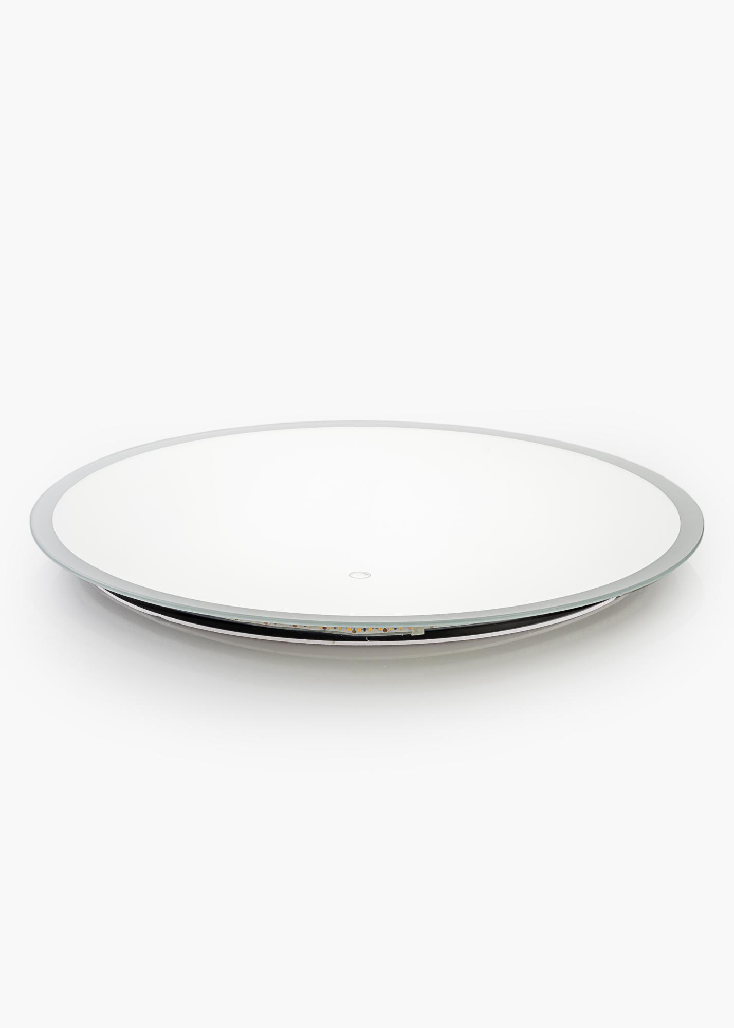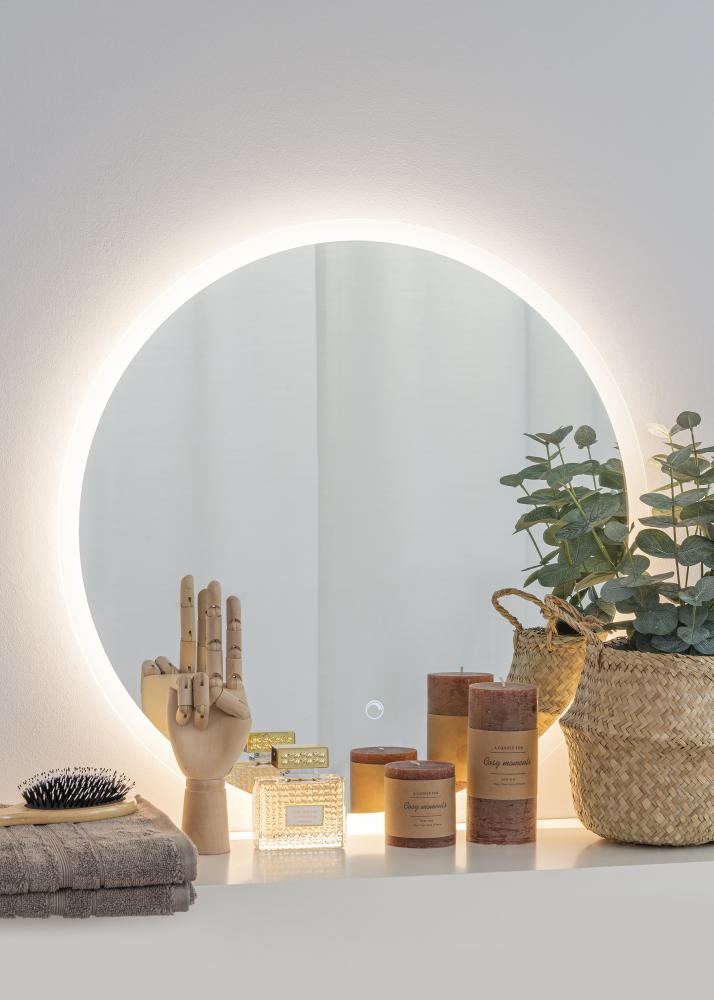 Klassischer, runder Badspiegel, formschön und elegant. Der Spiegel wird von einem gefrosteten Rand mit integrierter LED-Beleuchtung dekorativ umrahmt. Die LED-Beleuchtung ist dimmbar und kann einfach durch Gedrückthalten des wasserdichten Touch-Sensors für einige Sekunden lang eingestellt werden. Der angenehm warmweiße Lichtschein von 3000 K beleuchtet den Spiegel mit einem nach vorne hin strahlenden Lichtschein. Die letzte Einstellung wird beim erneuten Einschalten der Beleuchtung beibehalten. Dieser Spiegel ist mit Wandhalterungen versehen und für die Verwendung in Badezimmern geeignet. Der Spiegel ist für feste Installation vorgesehen und muss an einen Stromschalter angeschlossen werden.