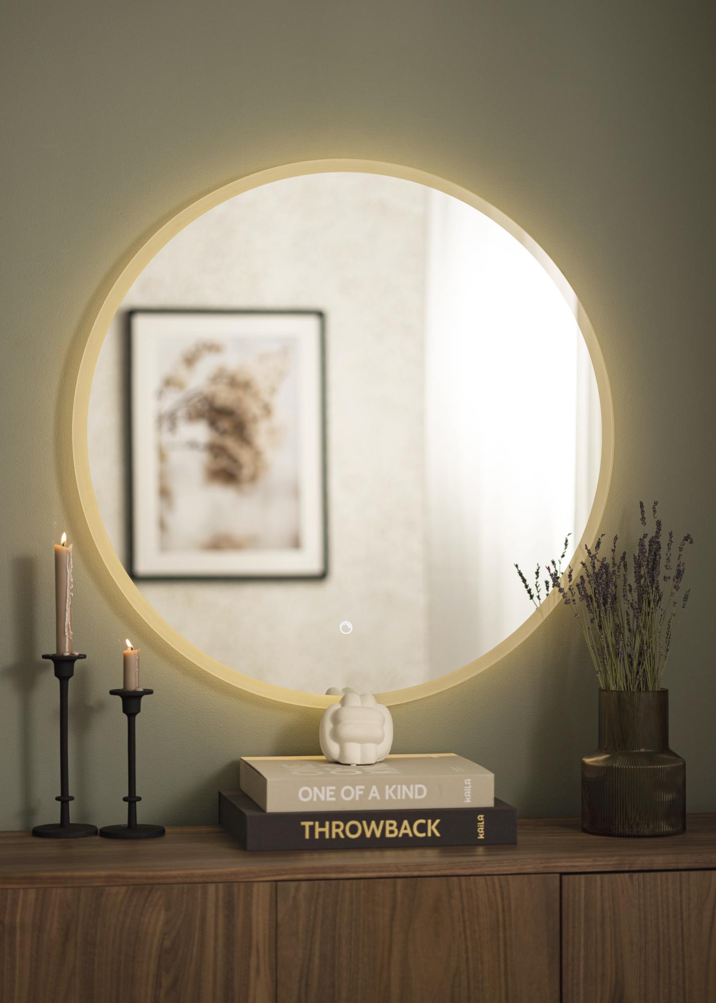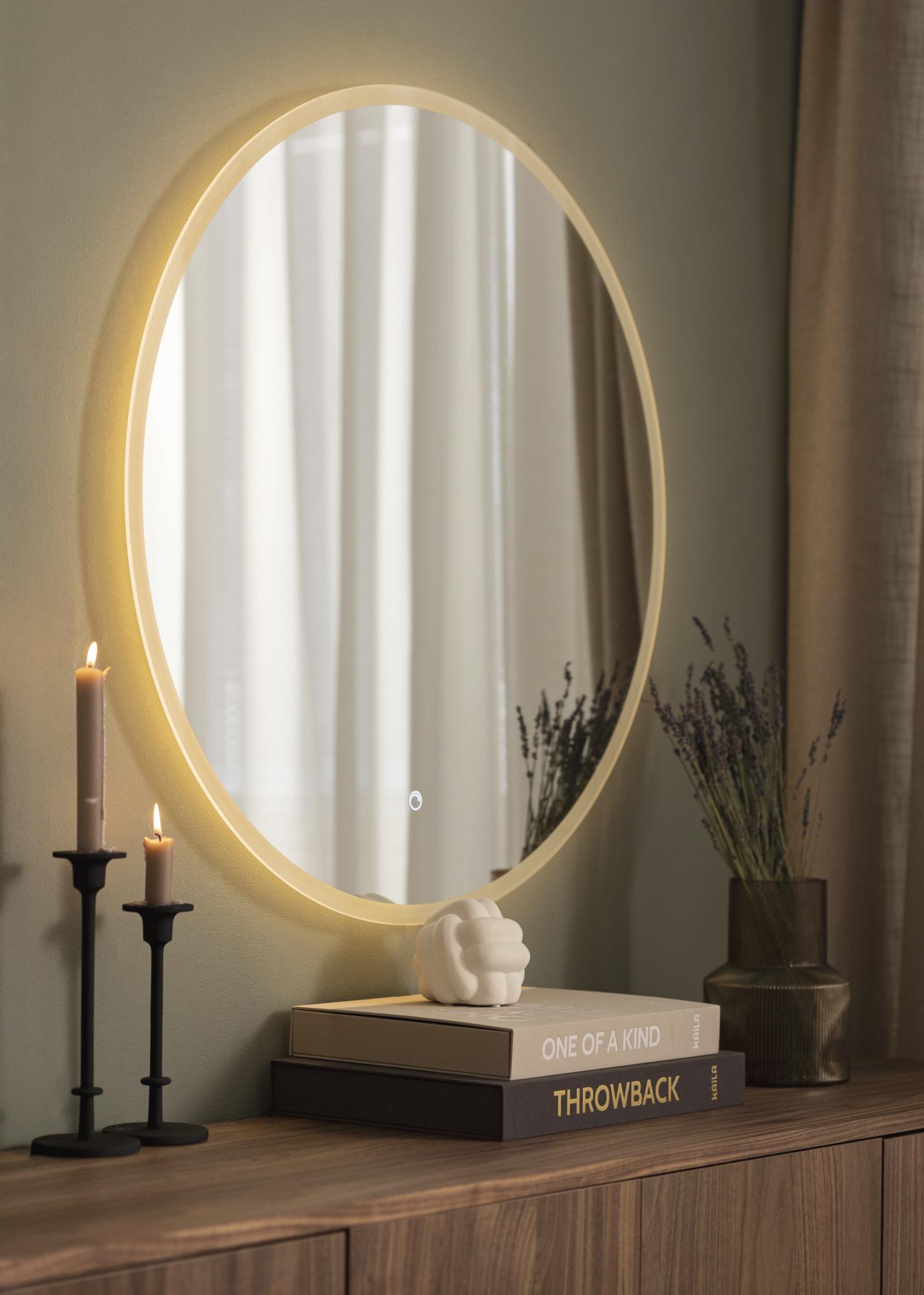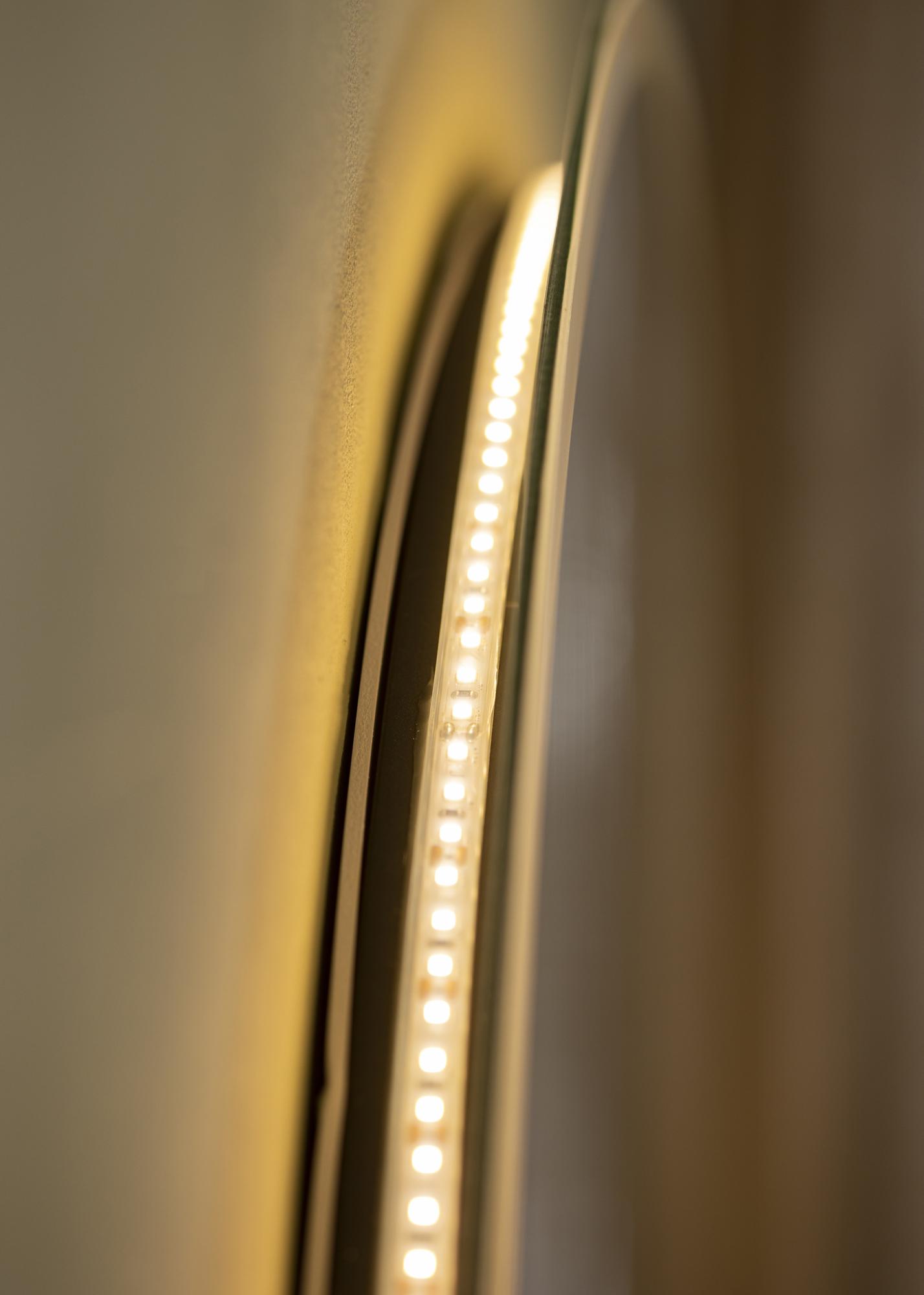 Klassischer, runder Badspiegel, formschön und elegant. Der Spiegel wird von einem gefrosteten Rand mit integrierter LED-Beleuchtung dekorativ umrahmt. Die LED-Beleuchtung ist dimmbar und kann einfach durch Gedrückthalten des wasserdichten Touch-Sensors für einige Sekunden lang eingestellt werden. Der angenehm warmweiße Lichtschein von 3000 K beleuchtet den Spiegel mit einem nach vorne hin strahlenden Lichtschein. Die letzte Einstellung wird beim erneuten Einschalten der Beleuchtung beibehalten. Dieser Spiegel ist mit Wandhalterungen versehen und für die Verwendung in Badezimmern geeignet. Der Spiegel ist für feste Installation vorgesehen und muss an einen Stromschalter angeschlossen werden. Damit der Spiegel ordnungsgemäß und korrekt funktioniert, muss er an einen normalen Schalter angeschlossen werden, nicht an einen Dimmschalter.