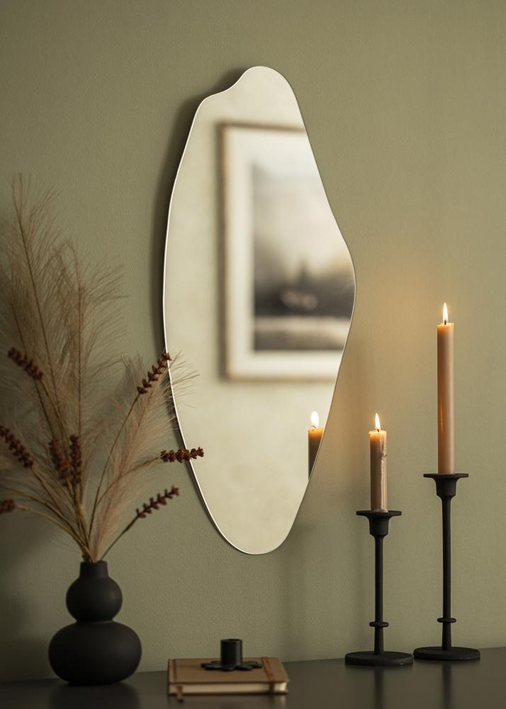 Dies ist ein länglicher Spiegel mit einer schönen asymmetrischen Form, was ihn zu einem spannenden Einrichtungsdetail macht, das perfekt in das moderne Zuhause passt. Der Spiegel verfügt über praktische Wandhalterungen auf der Rückseite und wird an der Wand in dem Raum aufgehängt, den Sie wünschen – er eignet sich sogar für die Verwendung im Badezimmer!