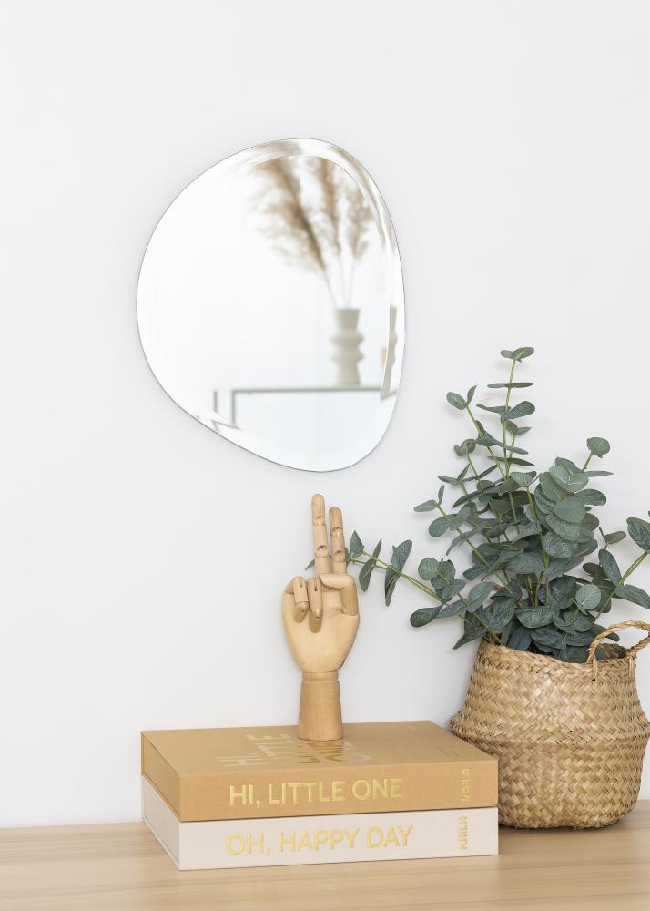 Dieser Wandspiegel von KAILA hat eine elegante asymmetrische Form, die an einen Tropfen erinnert. Der Spiegel ist sehr dünn und hat keinen Rahmen, was in Kombination mit einem luxuriös facettierten Rand seine elegante und moderne Optik noch verstärkt. Er ist ein äußert dekorativer Wandspiegel, der in jedem Raum, in dem er angebracht wird, garantiert alle Blicke auf sich zieht - im Wohnzimmer ebenso wie im Flur oder Schlafzimmer. Der Spiegel hat eine Größe von 30×35 cm.