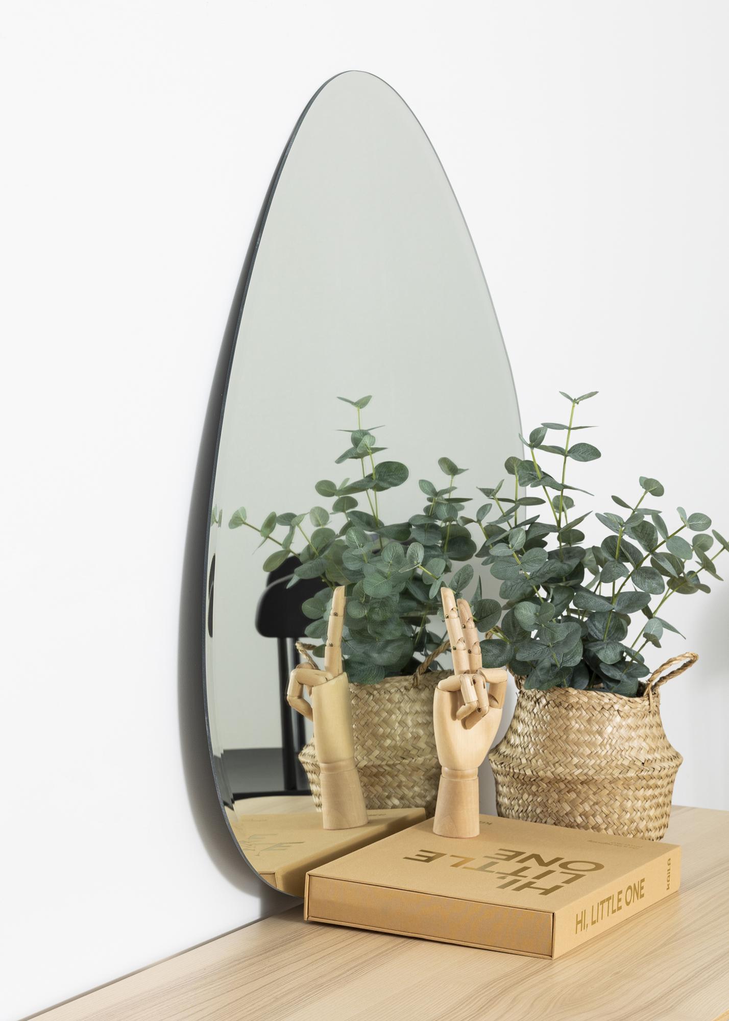 Dieser Wandspiegel von KAILA hat eine elegante asymmetrische Form, die an einen Tropfen erinnert. Der Spiegel ist sehr dünn und hat keinen Rahmen, was in Kombination mit einem luxuriös facettierten Rand seine elegante und moderne Optik noch verstärkt. Er ist ein äußert dekorativer Wandspiegel, der in jedem Raum, in dem er angebracht wird, garantiert alle Blicke auf sich zieht - im Wohnzimmer ebenso wie im Flur oder Schlafzimmer. Der Spiegel hat eine Größe von 70×81 cm.