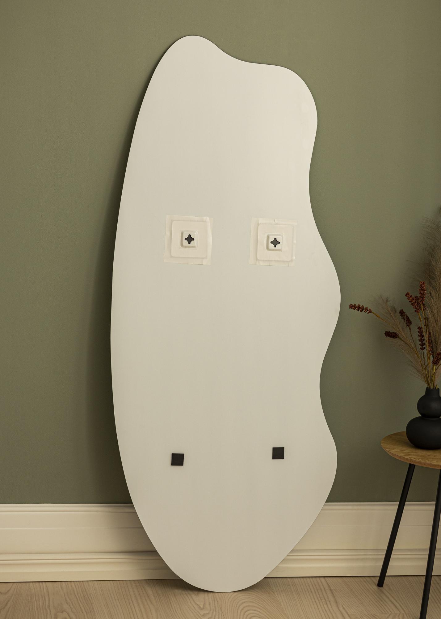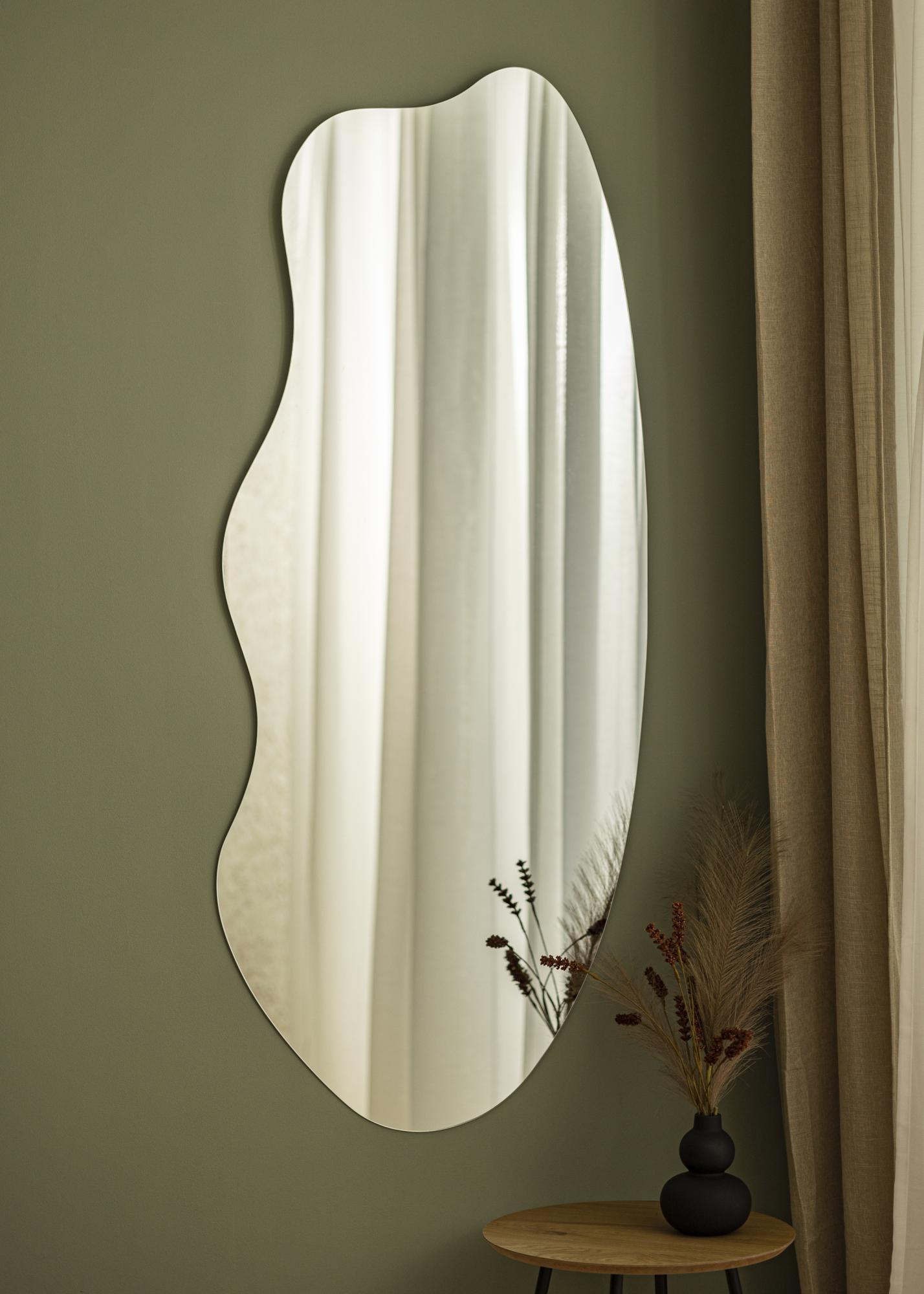Ein asymmetrischer Wandspiegel wird zu einem auffälligen Einrichtungsdetail in jedem Zuhause. Dieser Spiegel hat eine einzigartige Form, bei der eine Längsseite abgerundet und die andere wellenförmig ist. Zusammen bilden sie ein spannendes und elegantes Ganzes. Der Spiegel passt sowohl in den Flur als auch ins Wohnzimmer und funktioniert auch als trendiger Badezimmerspiegel.
