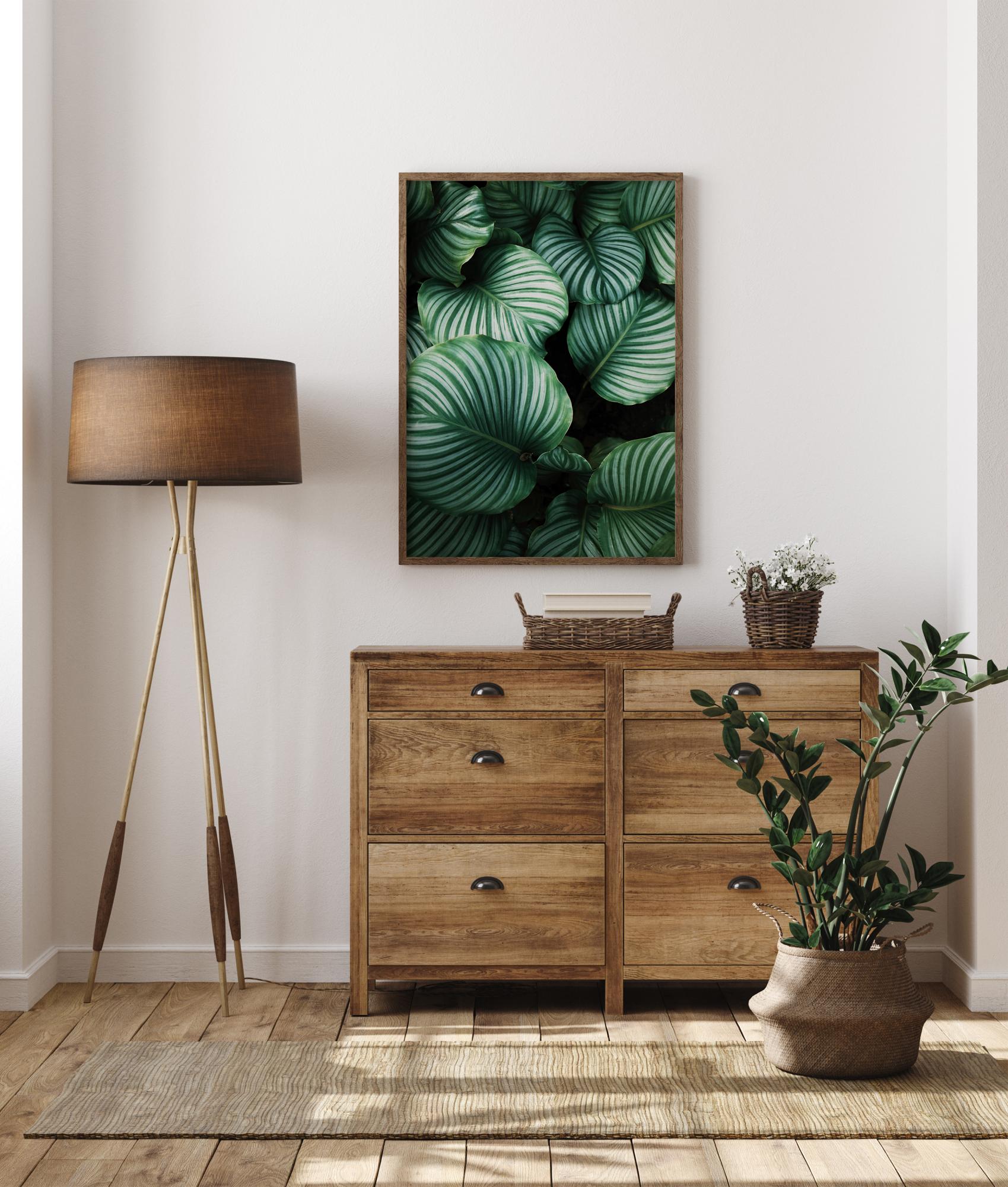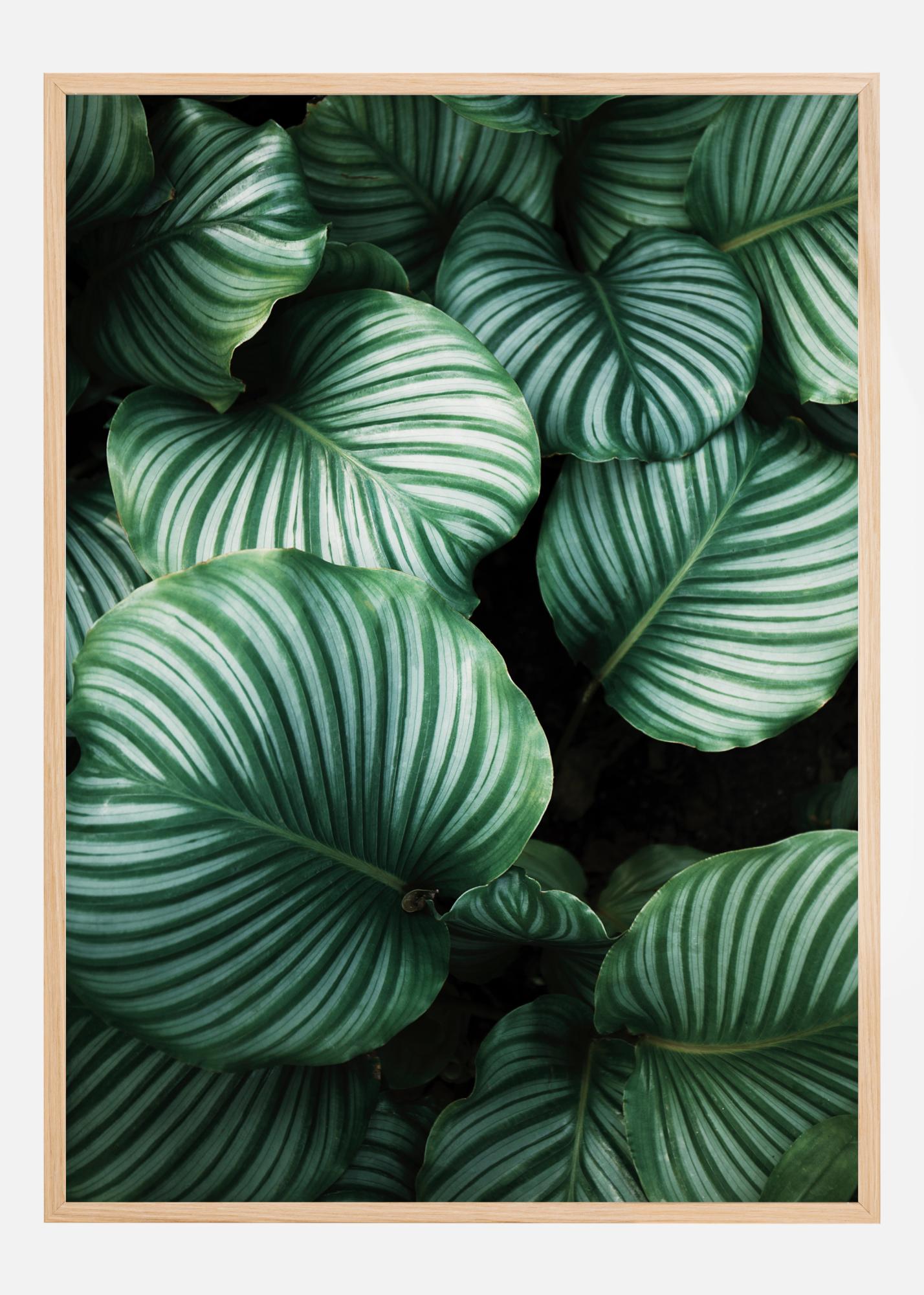 Eine wunderschöne Luftaufnahme von dunkelgrünen Calathea-Blättern. Das Sonnenlicht strahlt auf die Blätter und erzeugt ein intensives Licht. Die verschiedenen Grüntöne sorgen für ein intensives Ambiente und machen diesen Druck zu einem idealen Bild für ein von Pflanzen umgebenes Wohnzimmer.