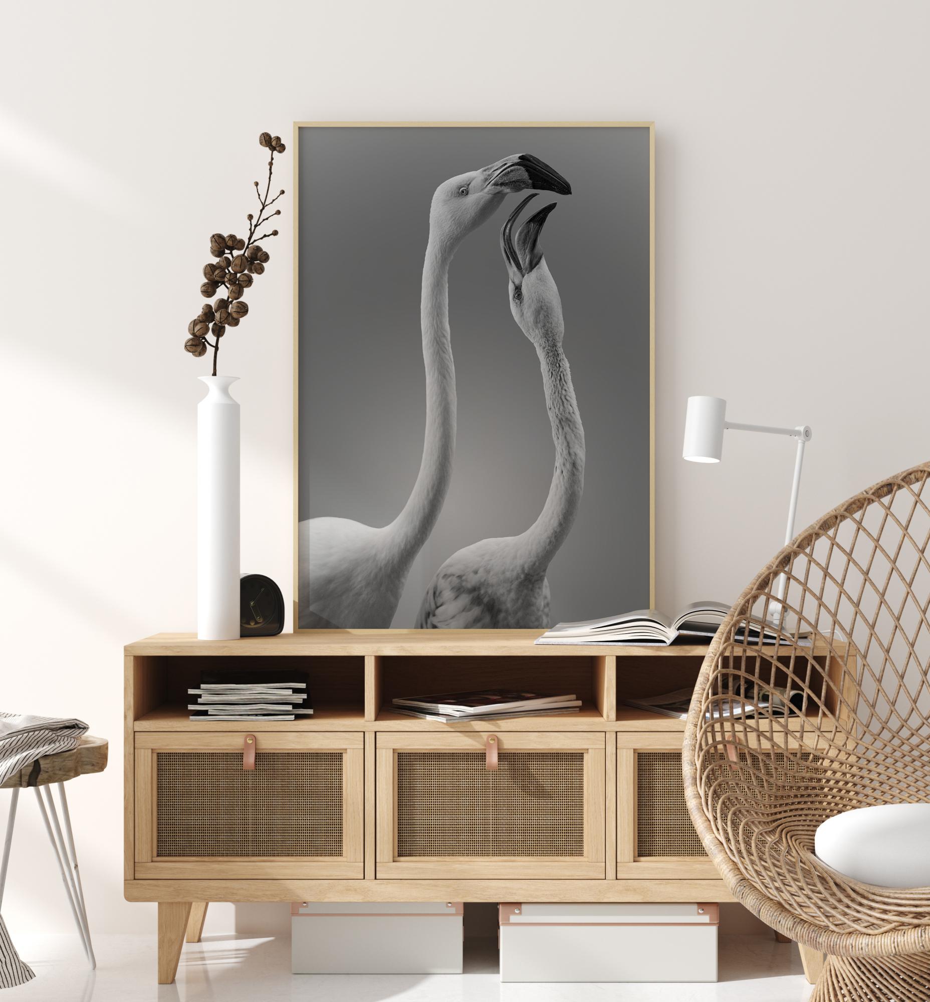 Ein Naturposter mit zwei Flamingos, die sich zum Kuss aufrichten. Die zurückhaltenden Grautöne dieses Schwarz-Weiß-Fotos stehen in einem schönen Gleichgewicht zu den Pastellfarben. Fühlen Sie sich ausgeglichen mit diesen beiden Vögeln.