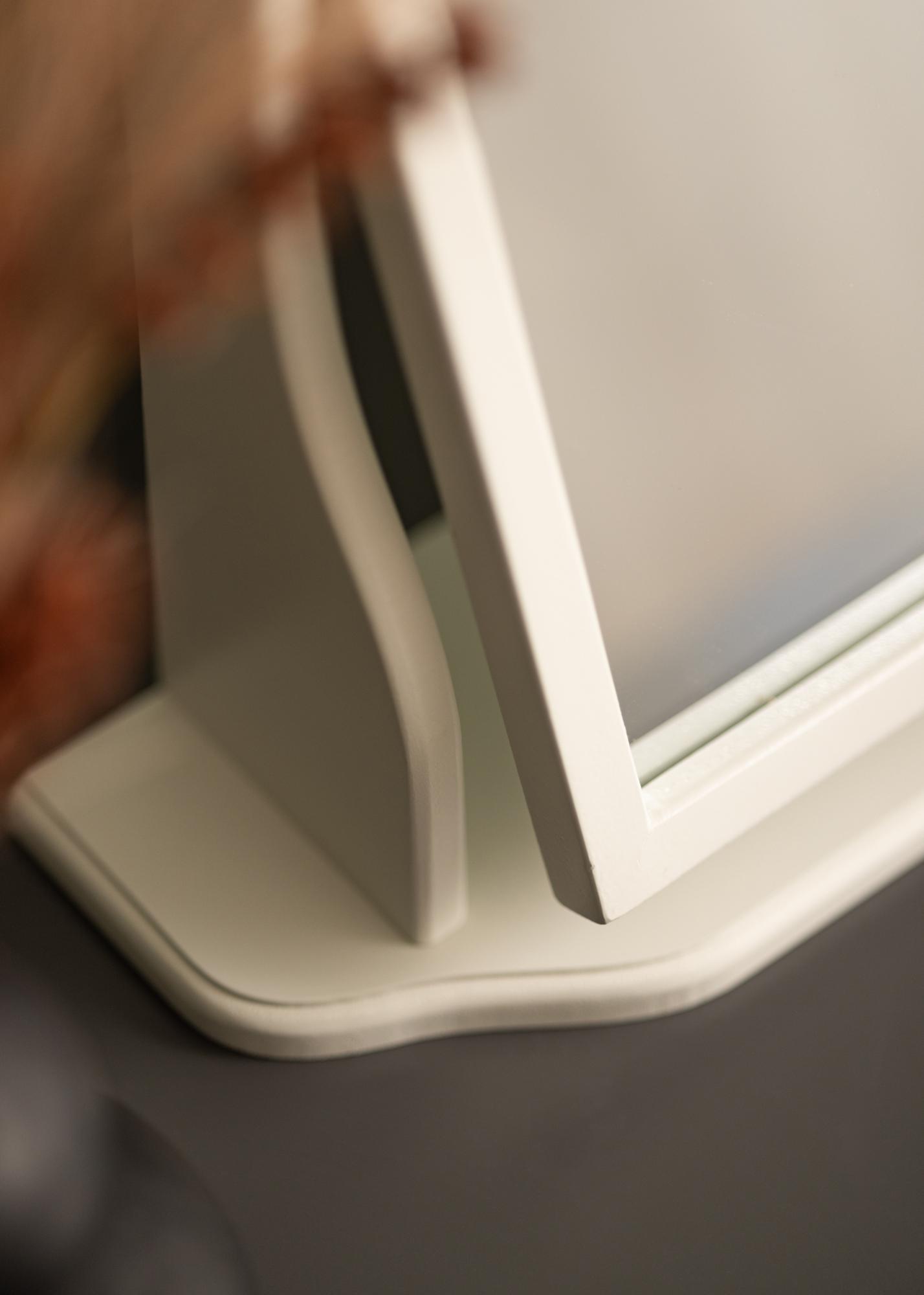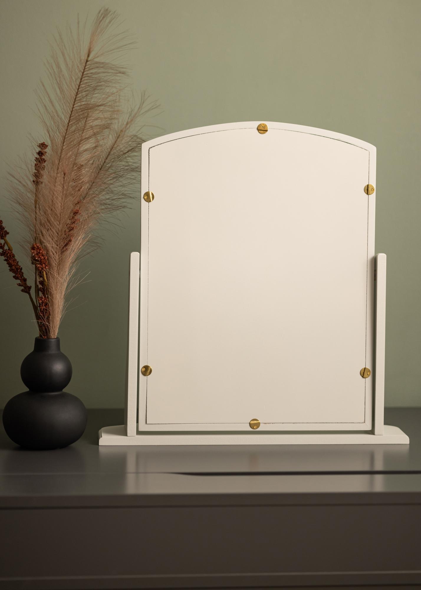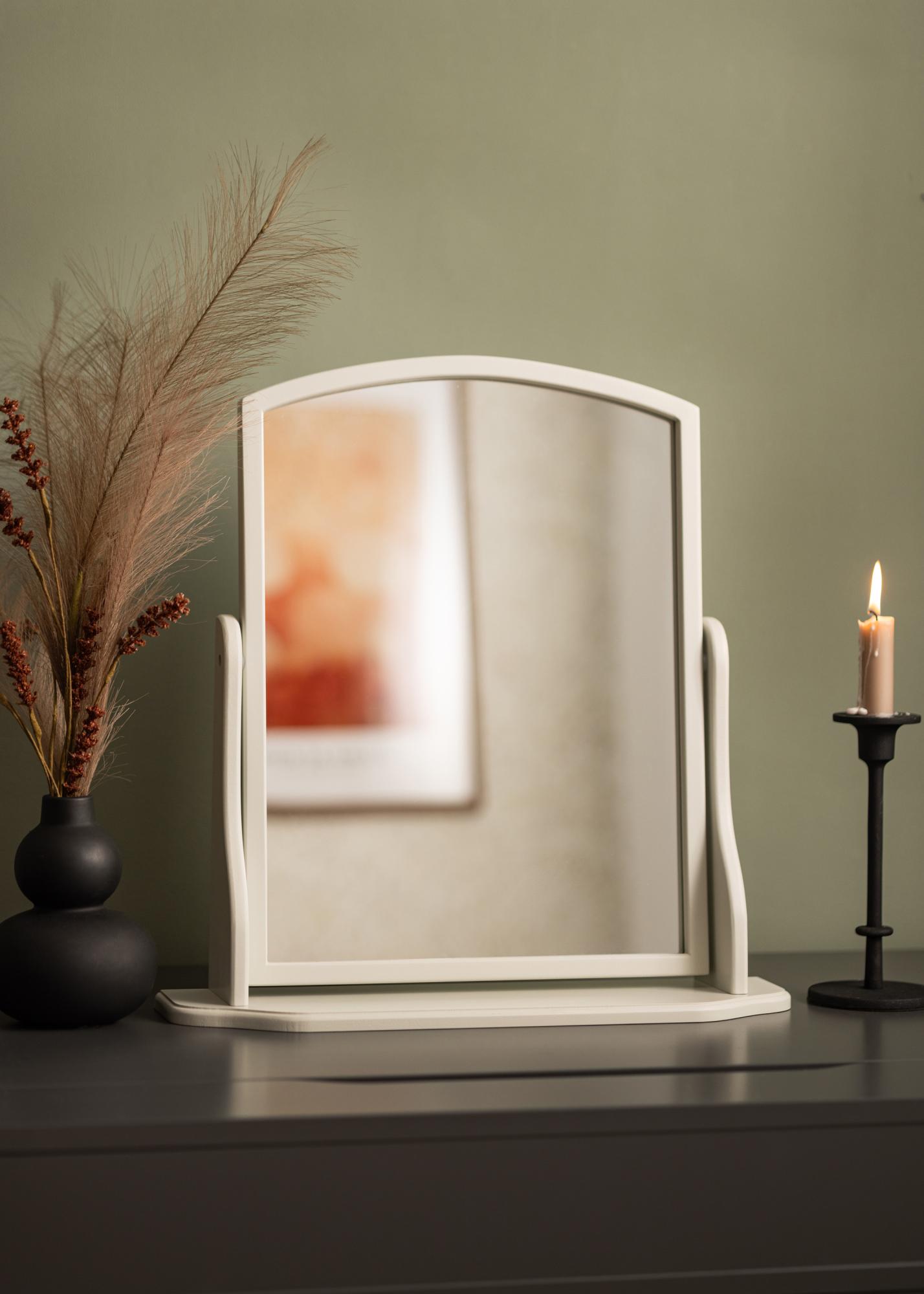 Dieser Spiegel ist mit einem grauen Rahmen gestaltet, der dem Raum eine subtile und anspruchsvolle Note verleiht. Er steht fest auf einer robusten Basis, was ihn ideal für die Verwendung auf einem Tisch oder einer Kommode macht, wo Sie sich für den Tag oder Abend vorbereiten.
