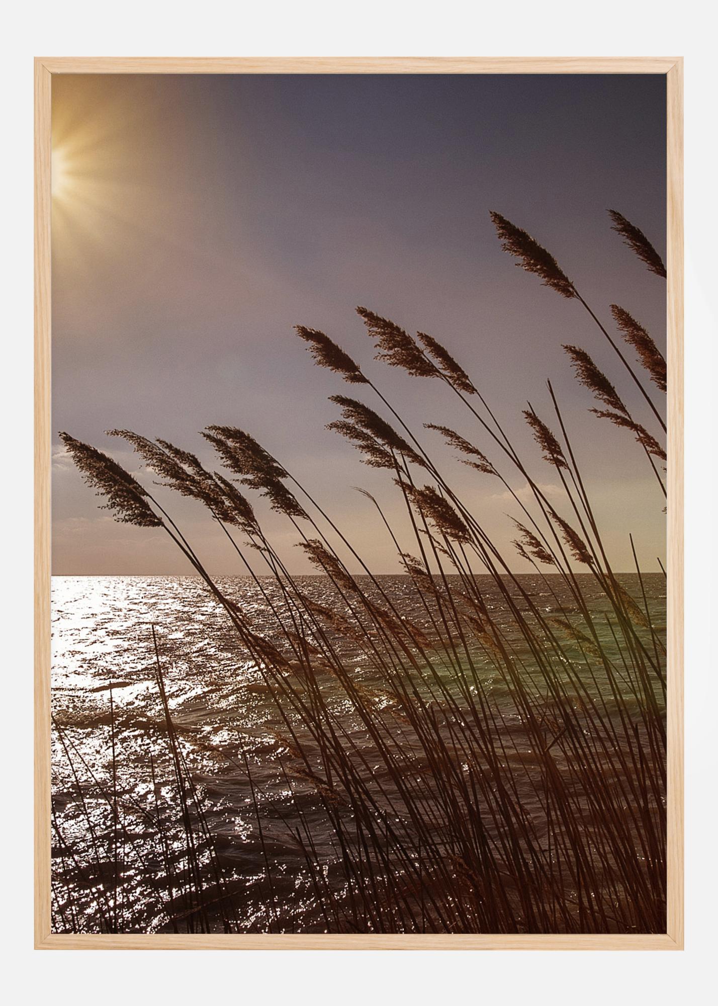 Ein schönes Sonnenuntergangsbild am Wasser. Die Sonne strahlt auf das Wasser, und die getrockneten Gräser wehen sanft im Wind. Die sanften Orangetöne vermitteln ein Gefühl von Frieden und Ruhe. Ein Muss für jedes Zimmer im Haus.