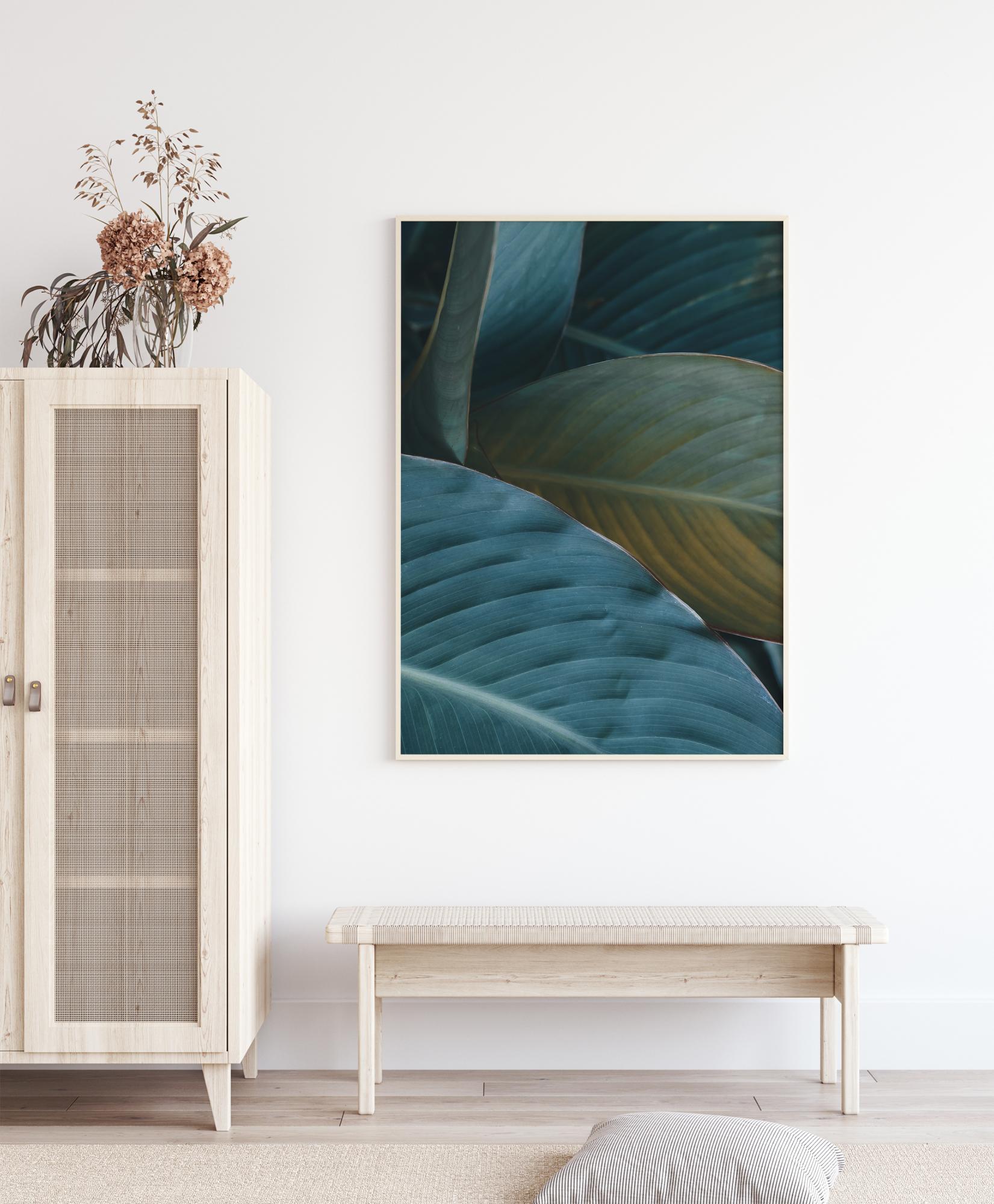 Eine Nahaufnahme von Blättern. Die Schlichtheit dieses Bildes spiegelt sich in den verschiedenen Grüntönen wider. Die Blätter sind zur Mitte hin heller. Das natürliche Licht scheint auf die Ränder und verleiht den Blättern ein goldfarbenes Aussehen. Ein schöner Druck, der in einem Raum voller Pflanzen hängen sollte.
