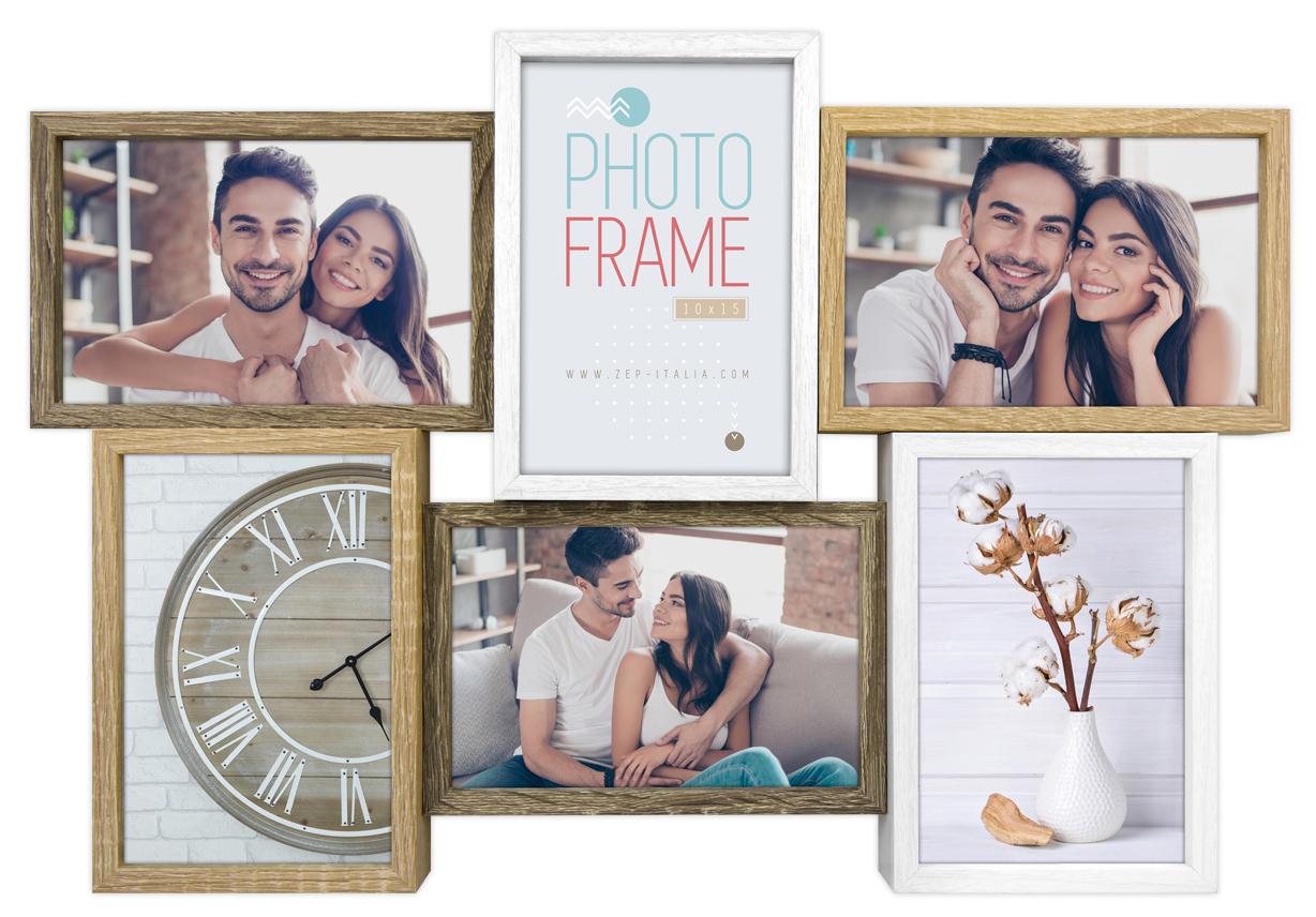 Dynamischer Collage-Bilderrahmen aus Holz. Der Collage-Bilderahmen ist in verschiedenen Farbtönen gehalten und überzeugt durch die schönen, naturfarbenen Einzelrahmen. Hier kannst du sechs deiner Lieblingsmotive, z.B. Fotos im Format 13x18 cm auswählen und hast sie immer toll arrangiert an einem Ort. Der Collagerahmen ist mit einer Wandhalterung versehen. Dieser Collage-Bilderrahmen lässt sich prima mit anderen Bildern, Fotos, Postern oder sonstiger Wanddekoration kombinieren und macht ein hübsches, persönliches Wohnaccessoire aus. Foto-Collagen, individuelle Wandbilder und Bilderwände sind immer eine tolle Wanddekoration und eignen sich auch super als persönliches Fotogeschenk für Freunde und Familie.