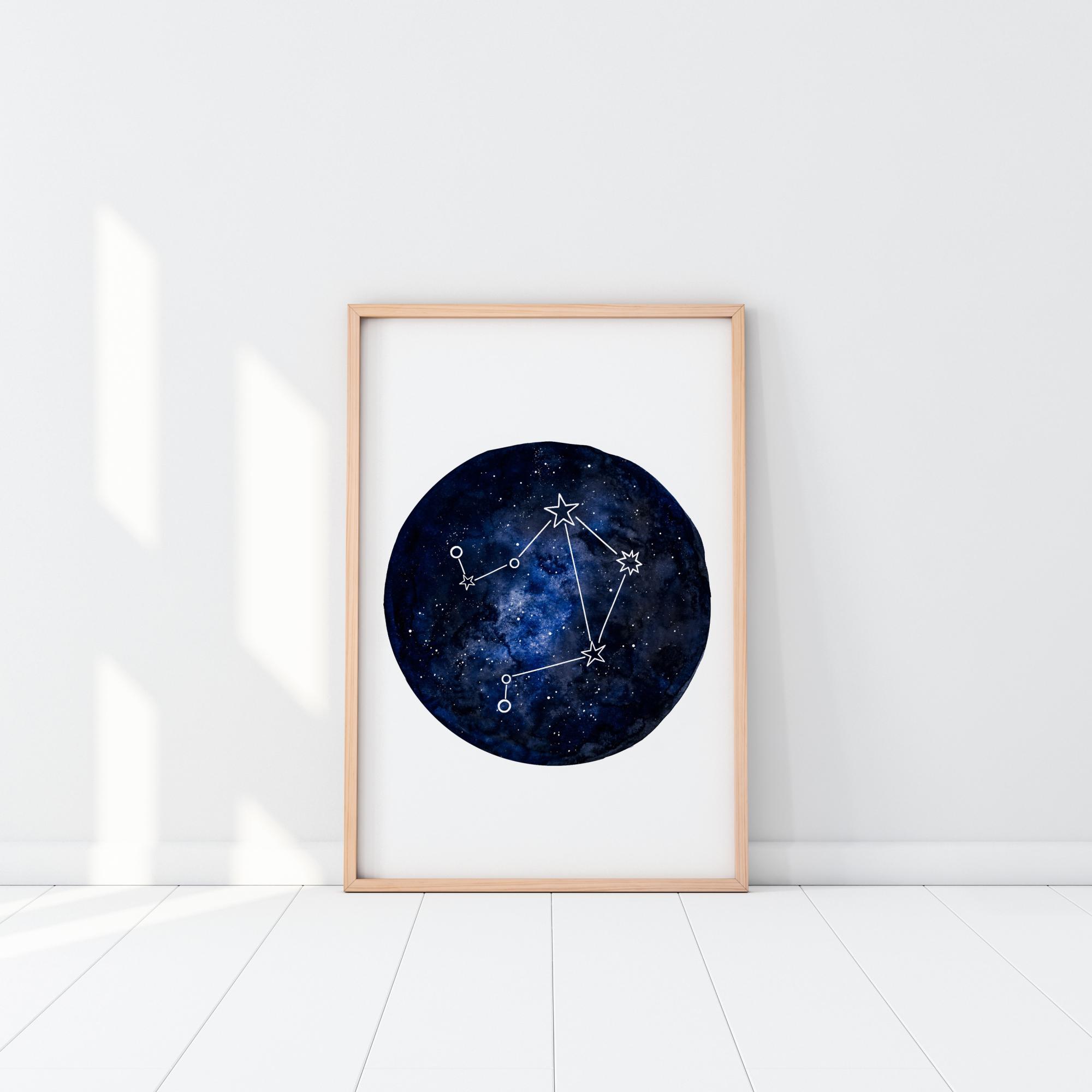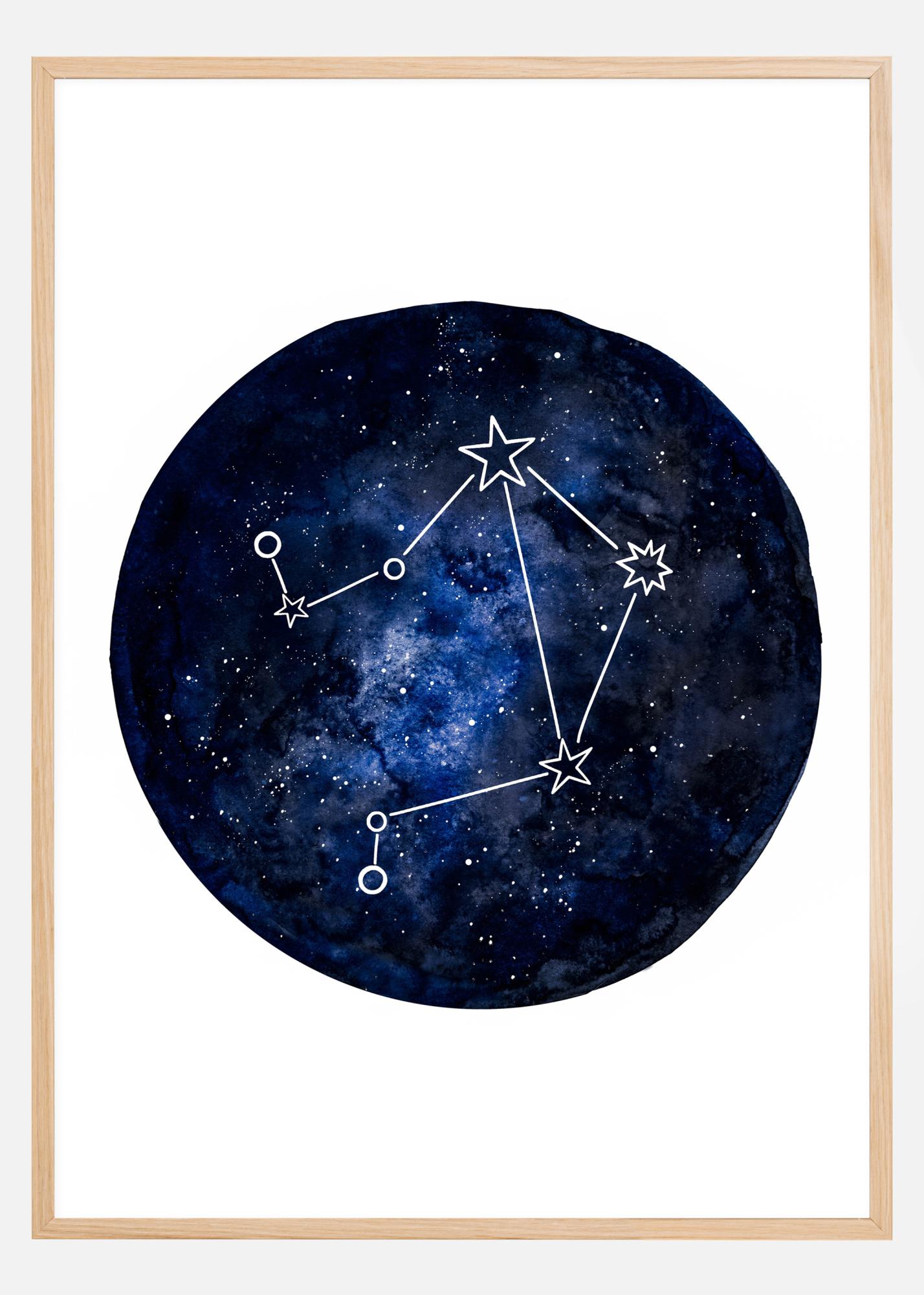 Eine kleinformatige astrologische Karte des Sternbilds Waage. Die dunkelblaue Karte auf weißem Hintergrund wird durch weiße Linien hervorgehoben, die das Sternbild der Waage umreißen. Ein ideales Geschenk für alle, die in diesem Sternzeichen geboren sind.