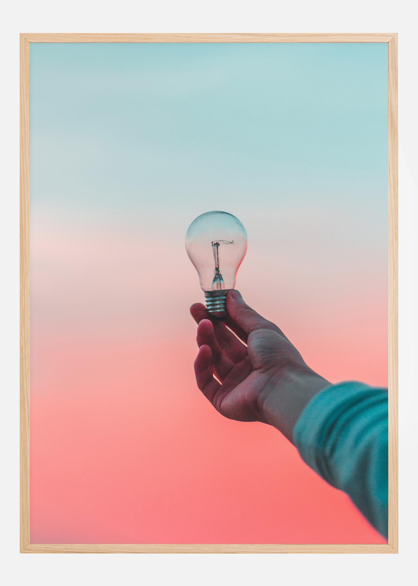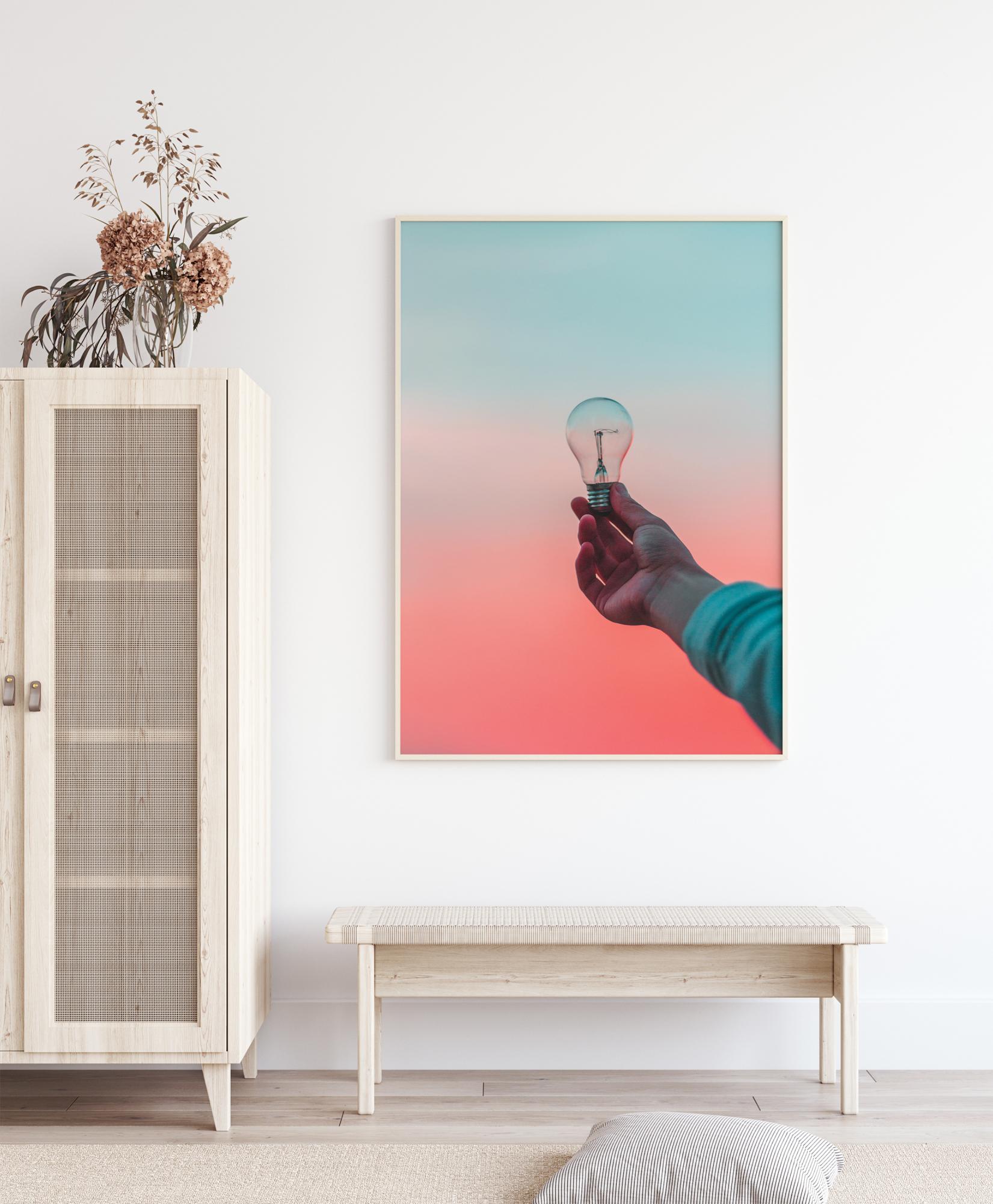 Ein einfacher Druck einer Glühbirne, die in den Himmel gehalten wird. Der schöne blassblaue Himmel unterstreicht den türkisfarbenen Pullover der Person, die die Glühbirne hält. Der untere Teil des Drucks reflektiert einen schönen Rosaton, der sich in der Glühbirne widerspiegelt. Ein beruhigender Druck, der an einer pastellfarbenen Wand wunderschön aussehen würde.