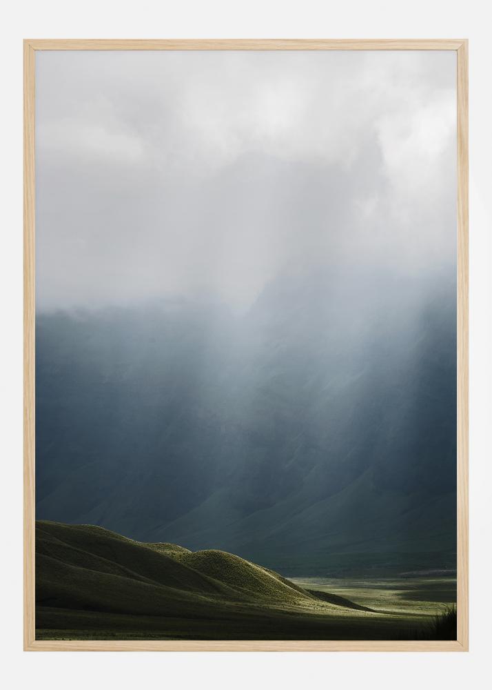 Ein atemberaubendes Landschaftsbild mit den dunkelgrünen Hügeln im Vordergrund. Die aufsteigenden Hügel auf der anderen Seite sind aufgrund des frühen Morgennebels kaum zu erkennen. Die sanften Grün- und Grautöne vermitteln ein beruhigendes und entspannendes Gefühl. Ein idealer Druck zum Aufhängen in einem Wohnzimmer.