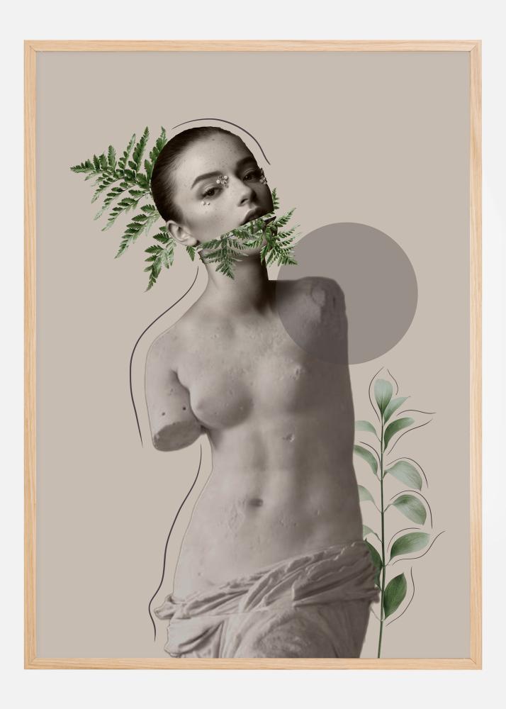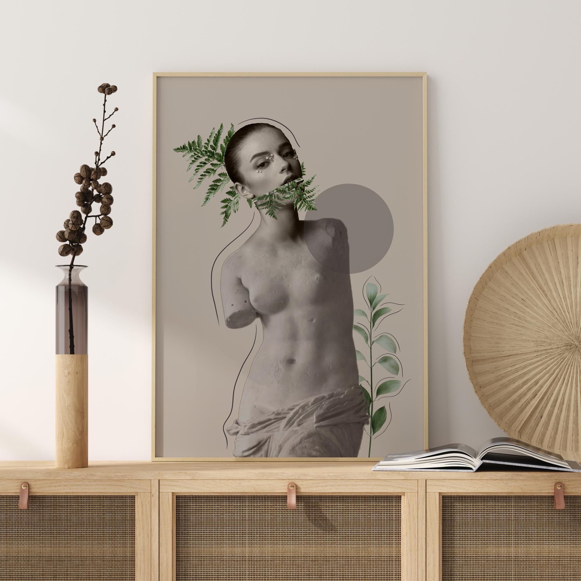 Ein ausdrucksstarkes Bild macht Decoupage zur Schönheit des Themas. Der Protagonist ist eine schöne Frau umgeben von Botanik auf einer antiken griechischen Statue. Ein delikater Kontrast zwischen modernem und antikem Zeitalter. Dieses Bild ist ein Statement-Akzent für ein minimalistisches Wohnzimmer.