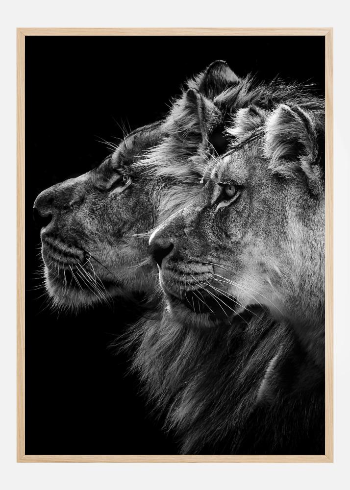 Ein fesselnder Schwarz-Weiß-Druck von einem Löwen und einer Löwin. Diese prächtigen Kreaturen auf schwarzem Hintergrund haben einen aufmerksamen Blick. Das natürliche Licht scheint auf die Kieferpartie der Tiere und lässt sie noch dominanter erscheinen. Ein idealer Druck für jeden Tierliebhaber.
