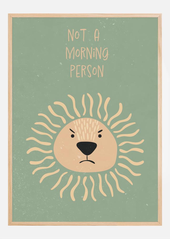 Mit einem verspielten Ausdruck und einer charmanten Botschaft ist dieses Poster ein lustiges Einrichtungsdetail für alle, die keine wirklichen Morgenmenschen sind. Die Illustration stellt einen niedlichen Löwen mit einer Frisur dar, die den Strahlen der Sonne ähnelt, begleitet von dem Text "NOT A MORNING PERSON" in einem entspannten, handschriftlichen Stil. Der gedämpfte grüne Farbton des Hintergrunds verleiht eine beruhigende Wirkung, während die warmen gelben und beigen Töne des Löwen ein weiches und einladendes Gefühl schaffen.