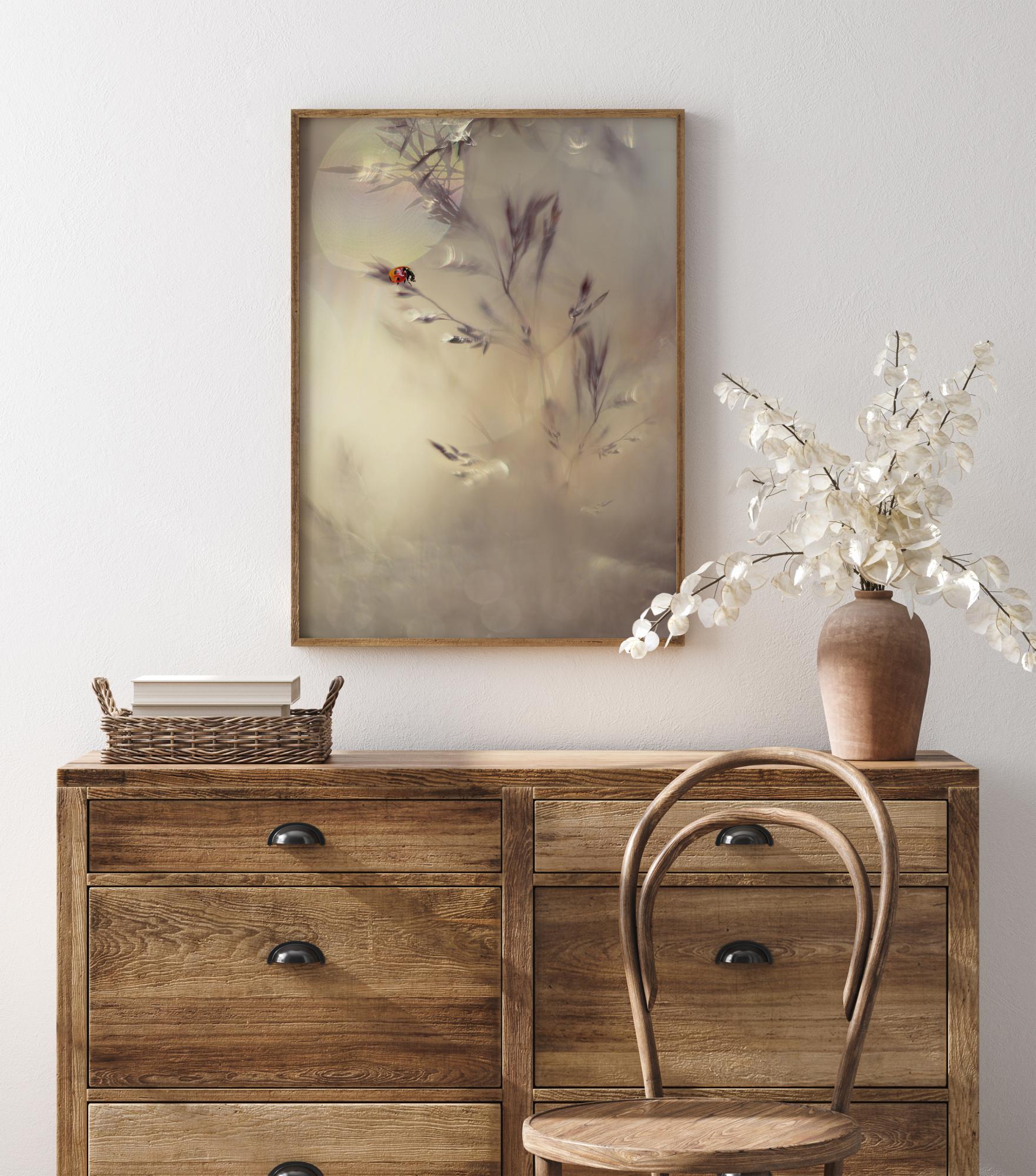 Ein nebliges Bild eines schönen Marienkäfers auf einem getrockneten Grashalm. Durch das sich in der Ferne spiegelnde Sonnenlicht kommen die leuchtenden schwarzen und roten Farben des Marienkäfers besonders gut zur Geltung. Die schönen nebligen Farben vermitteln ein Gefühl von Frieden und Ruhe. Ein schöner Druck für das Schlafzimmer.