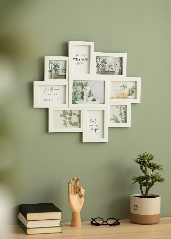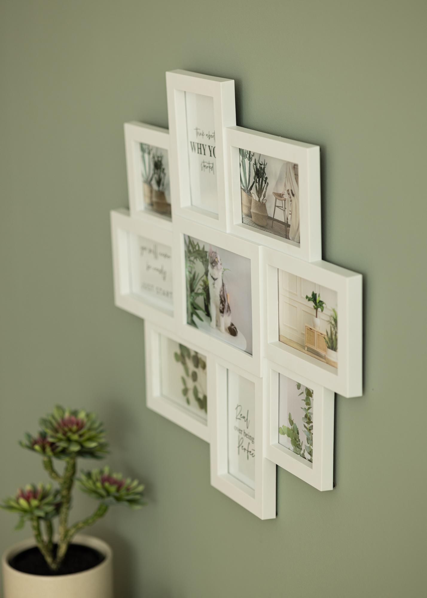 Mit diesem stilvollen Collagerahmen kannst du deine Lieblingsbilder in einem dekorativen Galerierahmen hübsch angeordnet und wunderschön in Szene gesetzt aufhängen. Dieser Collage-Bilderrahmen ist für 9 Bilder ausgelegt: 2 Bilder im Format 10x10 cm, 6 Bilder im Format 10x15 cm und 1 Bild im Format 13x18 cm. Die Bilder können teils sowohl im Hoch- als auch im Querformat eingelegt werden, sodass hier eine größere Flexibilität besteht, was die Auswahl der Fotos betrifft. Der Collagerahmen hat eine leicht asymmetrische Form, die dem Rahmen einen trendigen, modernen Ausdruck verleiht.
