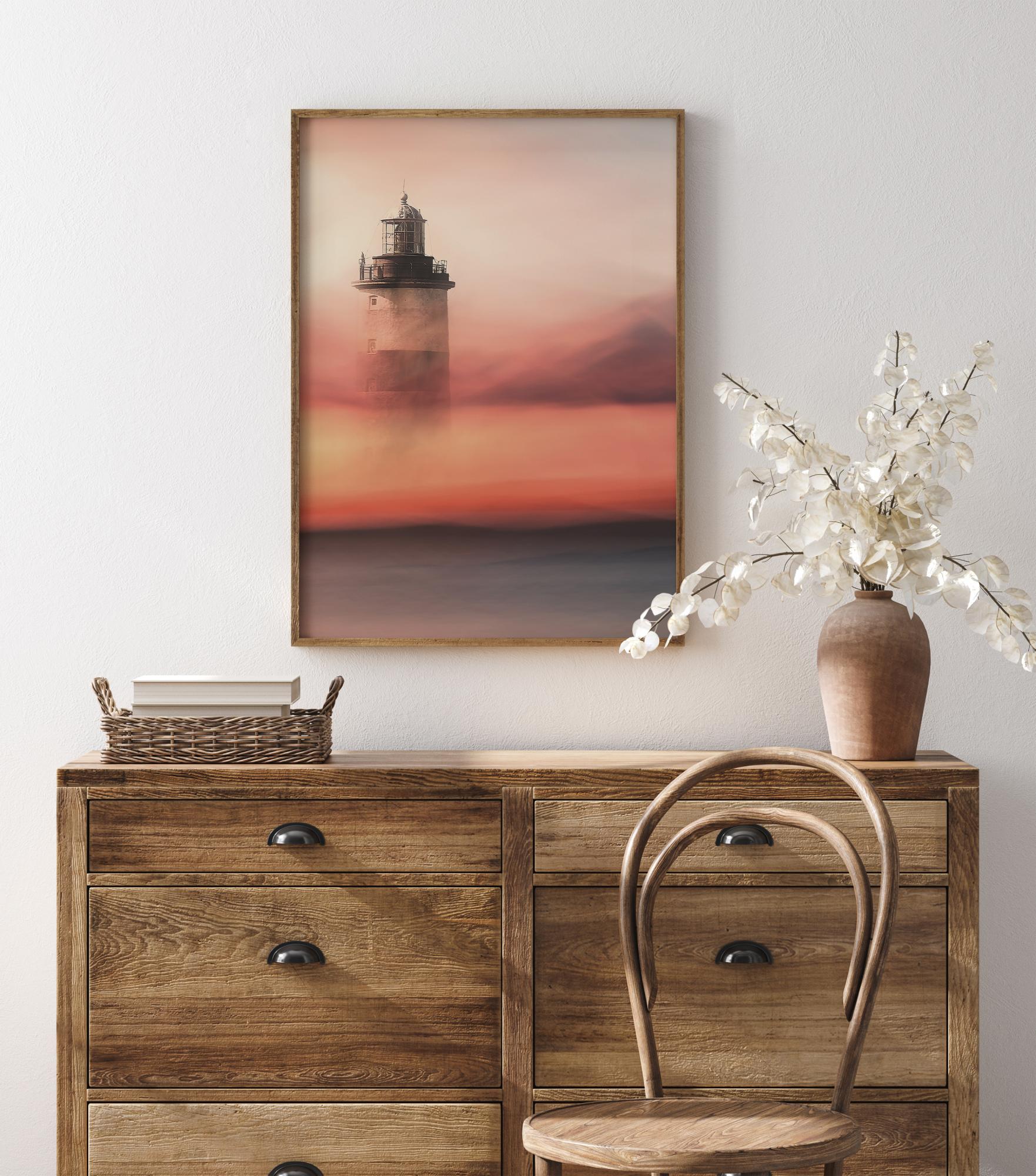 Ein wunderschöner romantischer Druck eines Leuchtturms im Meeresnebel. Die sanften, rosafarbenen Pastellfarben vermitteln ein Gefühl von Romantik, während das zartblaue Meer diesem schönen Bild einen dunkleren Ton verleiht. Spüren und hören Sie die Meeresbrise, wenn Sie dieses Bild bei sich zu Hause aufhängen.