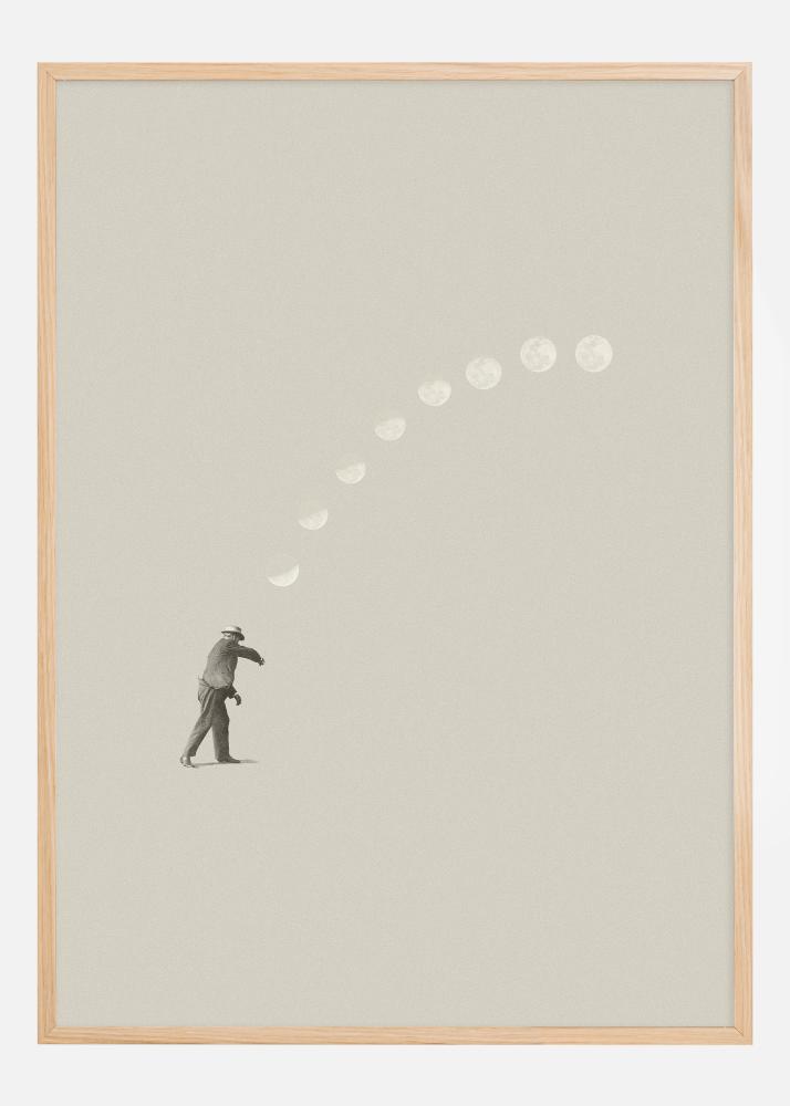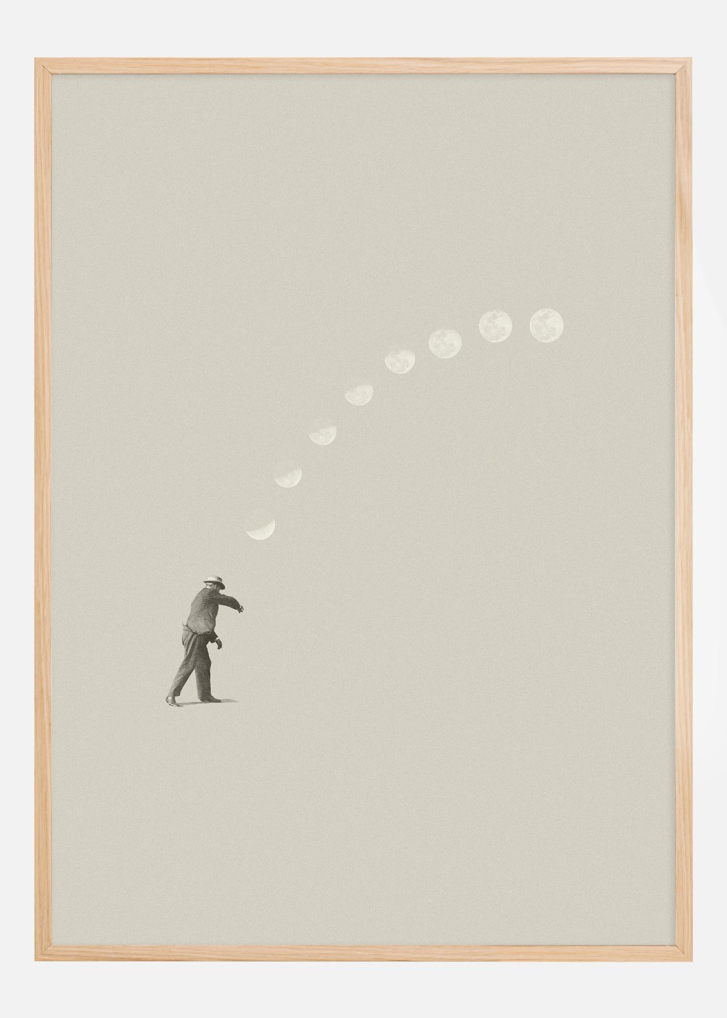 Dieses poetische Poster porträtiert eine Silhouette eines Mannes, der mit einer kraftvollen Bewegung einen Mond in den Himmel wirft. Es ist eine Szene, die den Moment einfängt, in dem ein Mond elegant entsandt wird und eine Bahn verschiedener Mondphasen bildet. Diese Handlung symbolisiert vielleicht Träume und Ambitionen, die in unendliche Möglichkeiten geschossen werden. Die Minimalismus des Bildes verstärkt die kraftvolle Geste und lässt dem Betrachter Raum, seine eigene Geschichte und Bedeutung zu füllen.