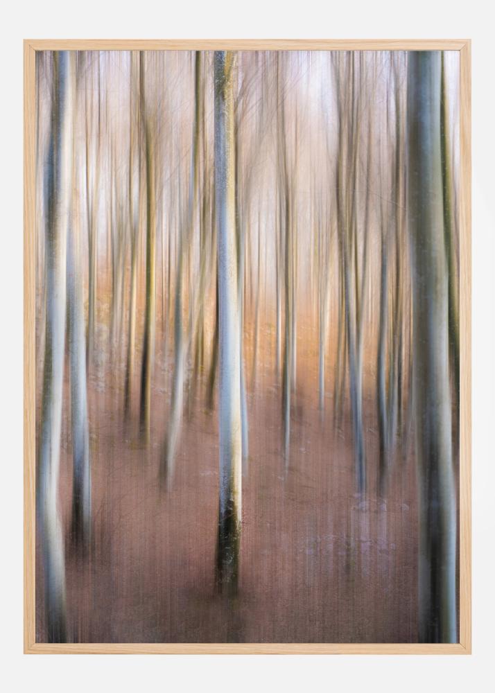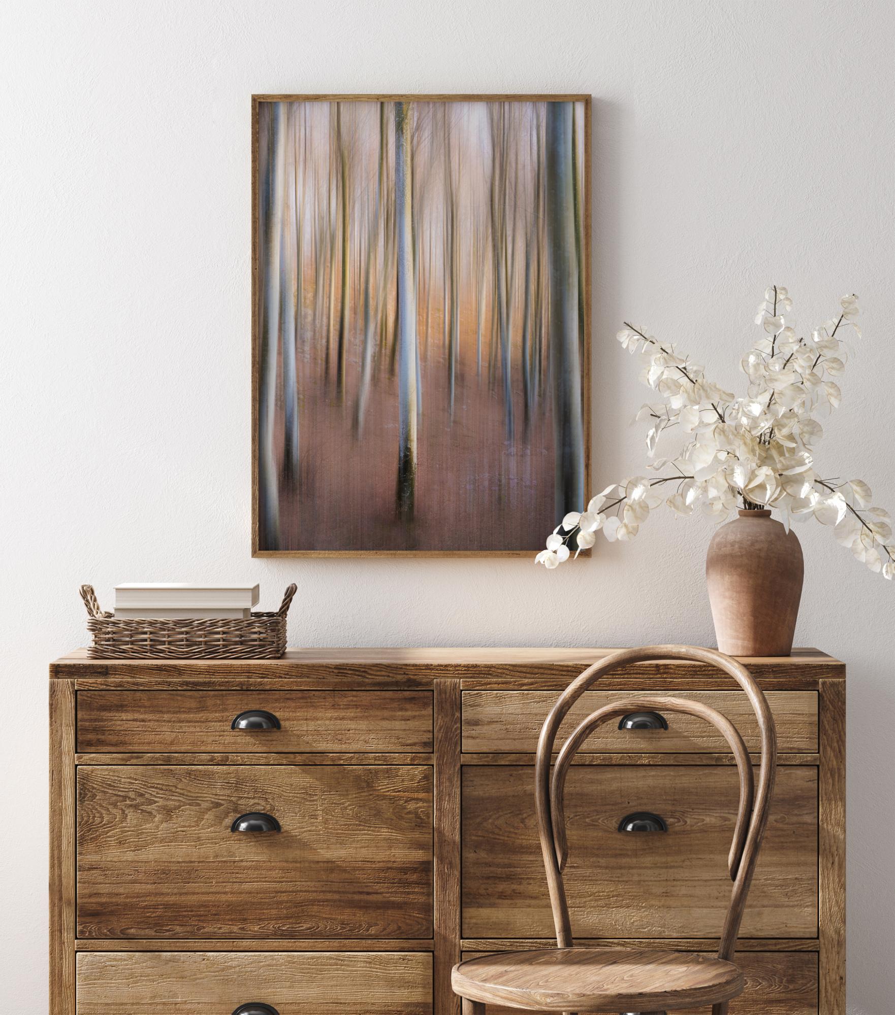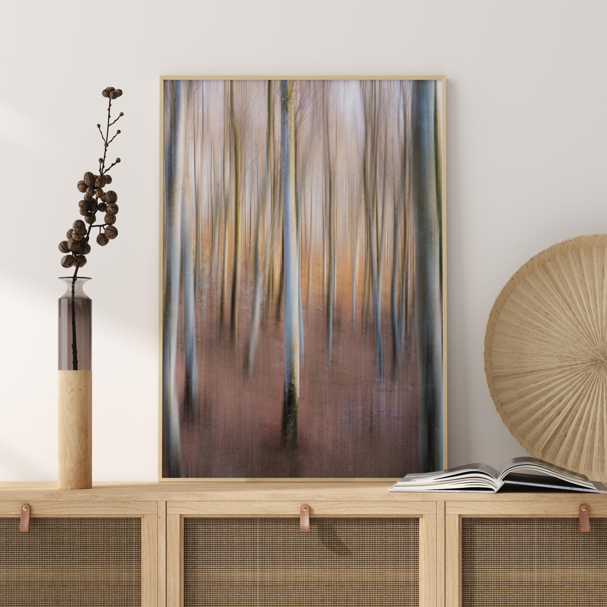 Ein schönes, aber geheimnisvolles Bild eines magischen Waldes. Durch das natürliche Licht kommen die magischen Pastellfarben der hohen Baumstämme besonders gut zur Geltung. Hören Sie die Stille des Waldes, wenn Sie dieses Bild bei sich zu Hause aufhängen.