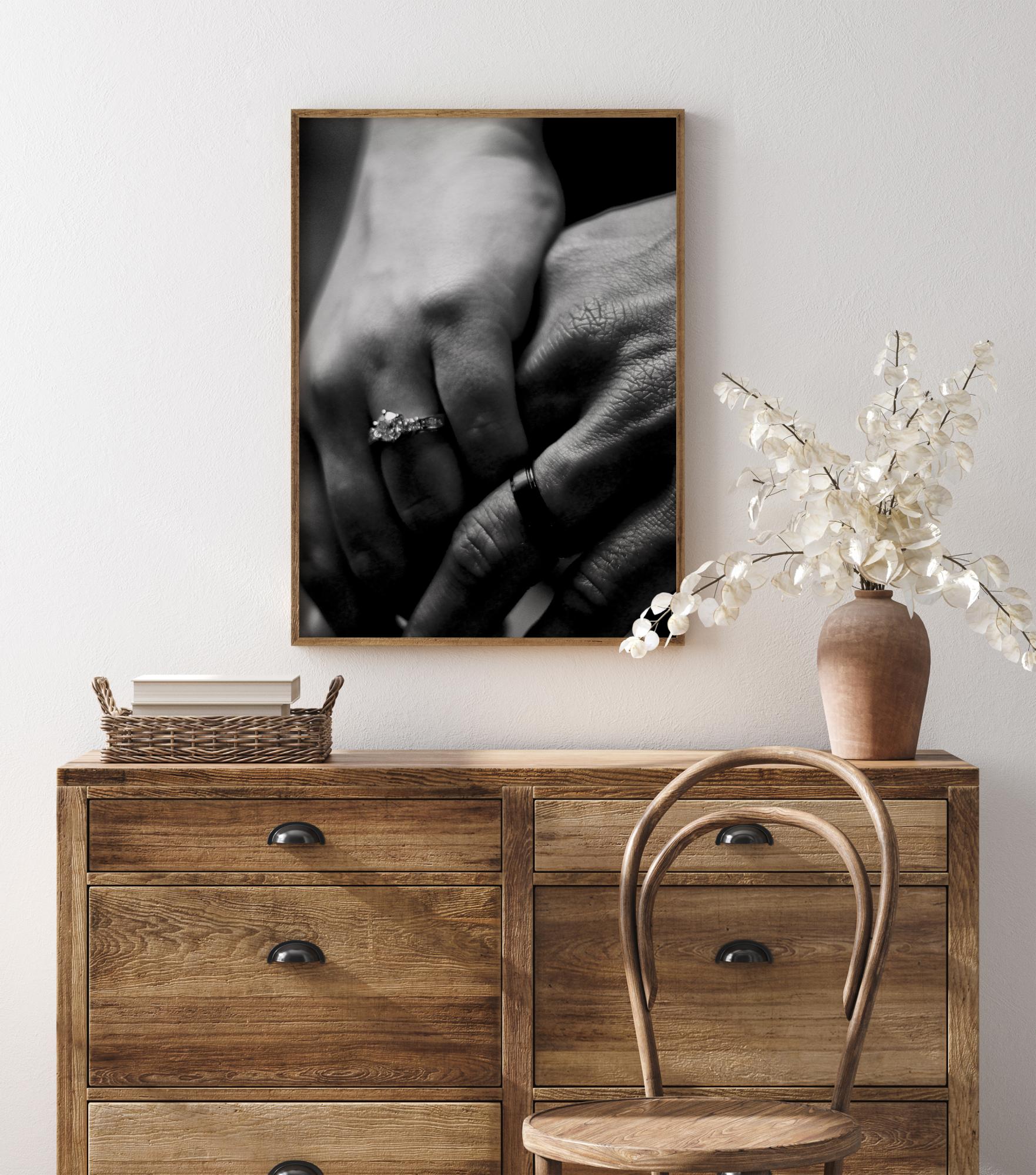 Ein romantischer Schwarz-Weiß-Druck von zwei Händen, die Ringe tragen. Ein starkes und emotionales Bild vor einem dunklen Hintergrund. Das natürliche Licht scheint auf den kleinen diamantförmigen Ring. Ein romantisches Bild zum Aufhängen an einer Schlafzimmerwand.