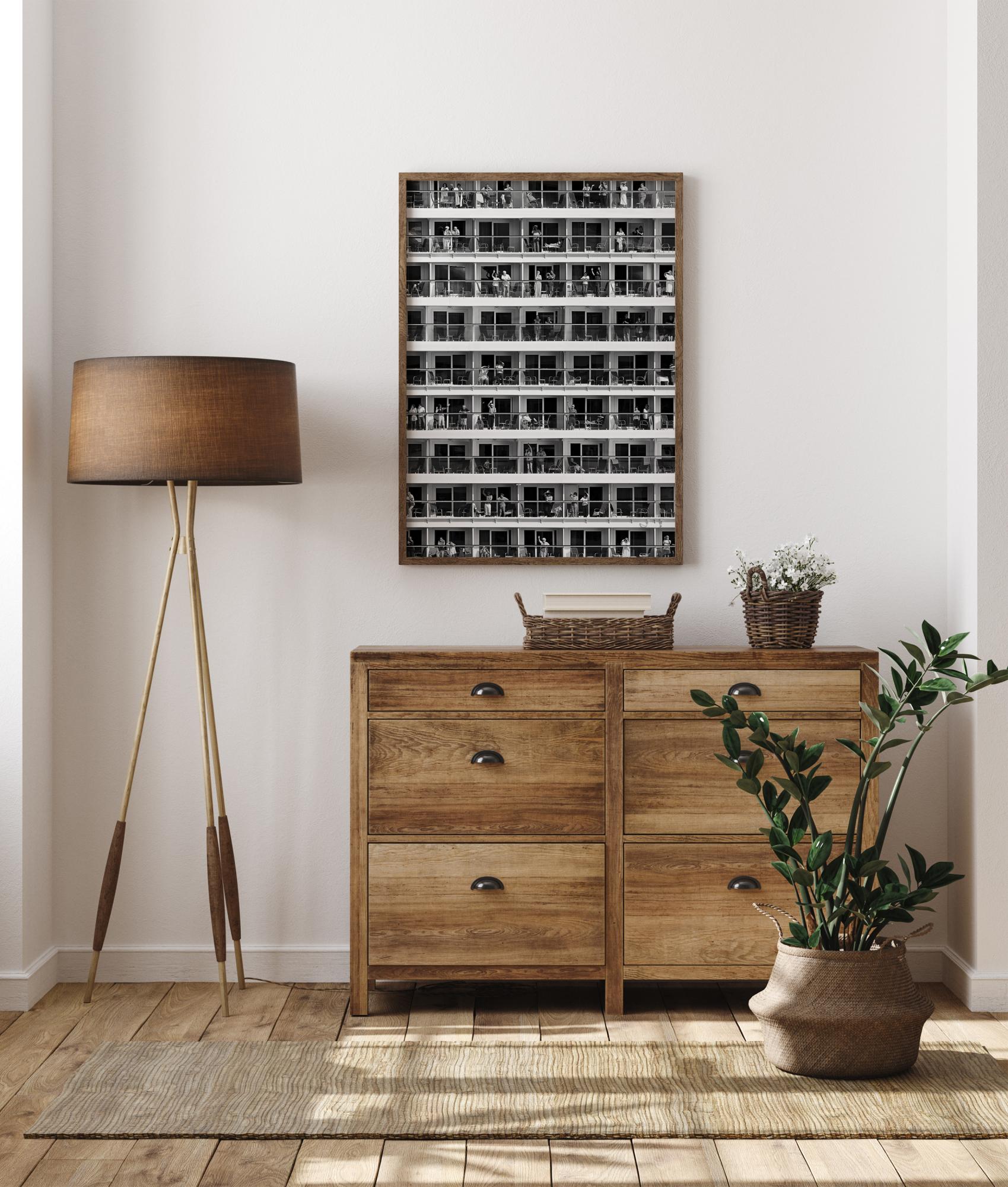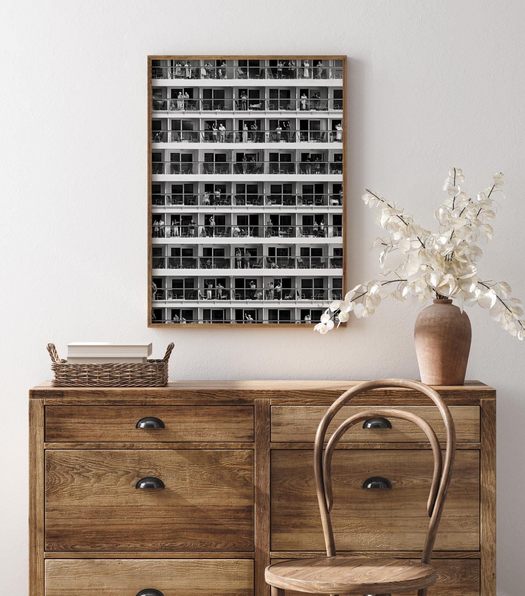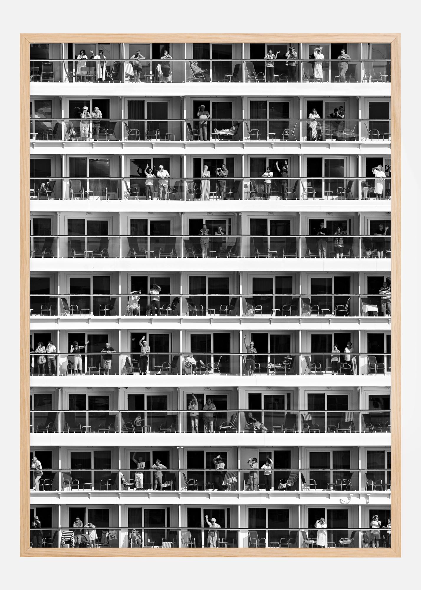 Ein geometrisches Reiseposter mit Reihen von Balkonen und Menschen, die die Sonne genießen. Spüren Sie die Liebe, wenn Sie all den freundlichen Gesichtern auf diesem phantasievollen Reisebild zuwinken.