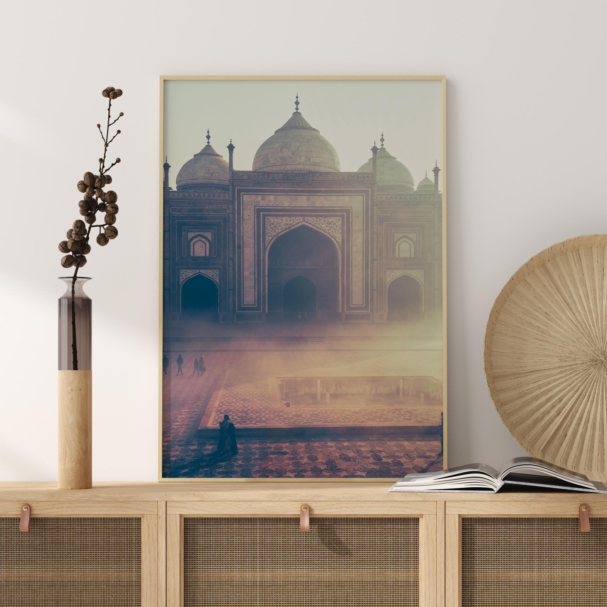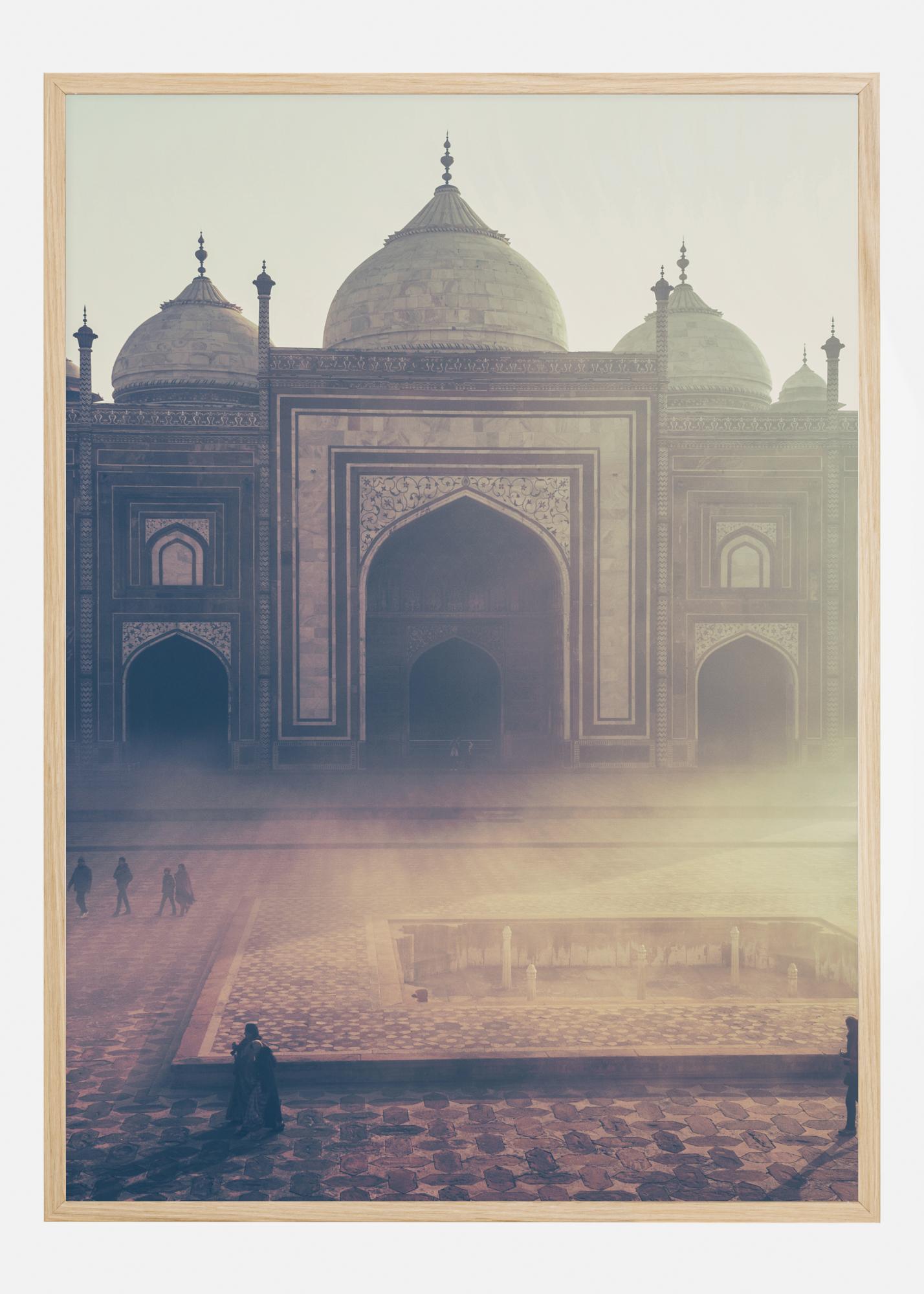 Das spirituelle Zentrum der muslimischen Welt steht erhaben über dem Platz im Vordergrund. Eine kleine Gruppe von Menschen schlendert durch den hell erleuchteten Nebel über den Platz. Der größte der Eingänge zur Moschee wird von kleineren Eingängen links und rechts davon flankiert. Ein friedlicher Druck, der eine beruhigende Atmosphäre schafft.