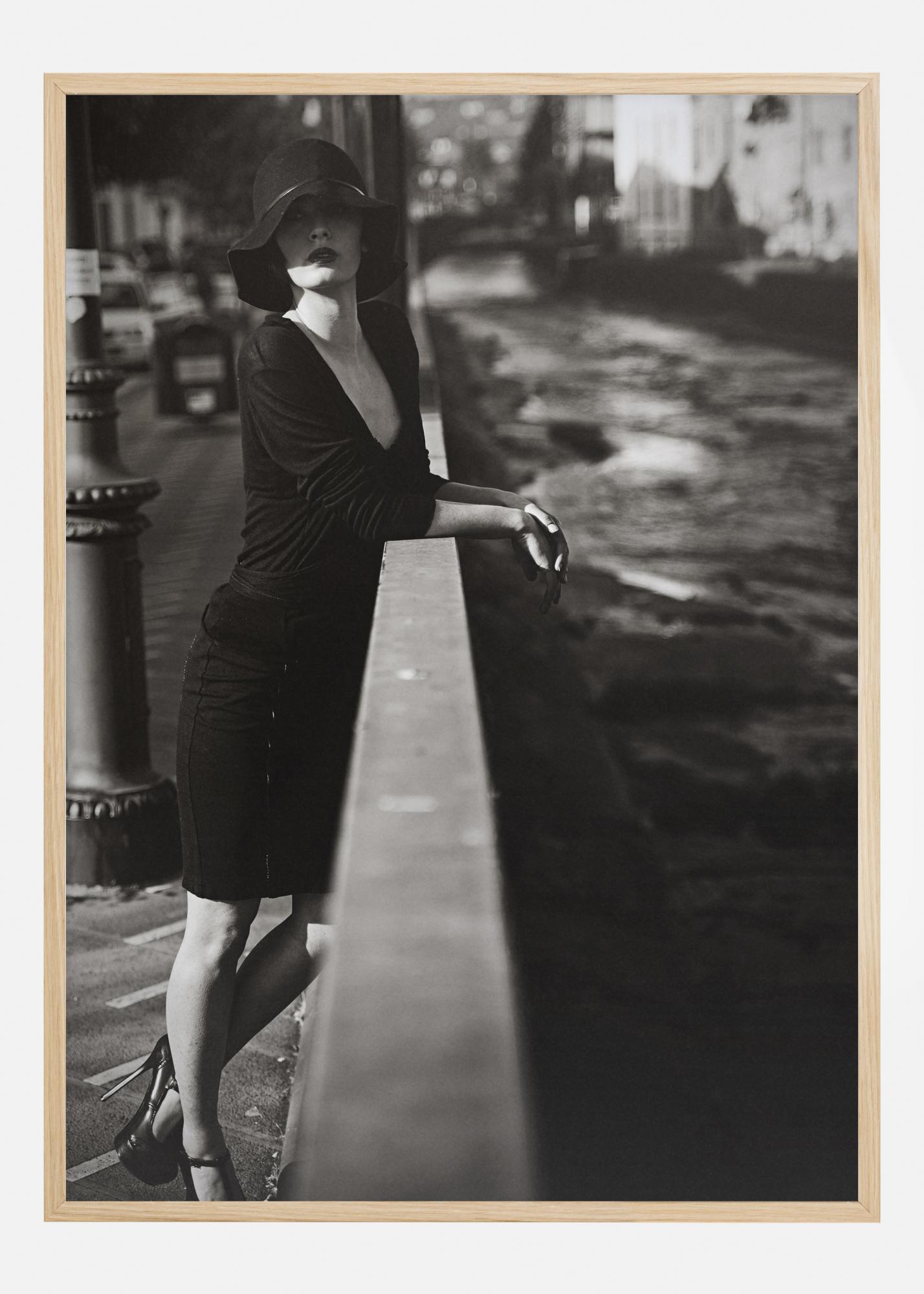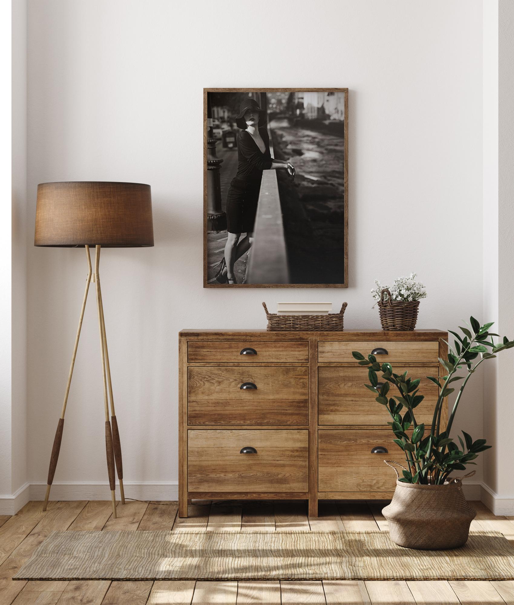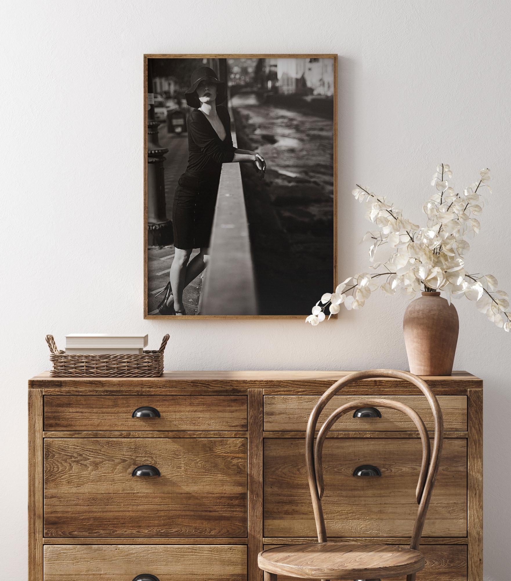 Ein Porträt einer Dame, die sich an eine Wand lehnt. Dieses fabelhafte Foto strahlt Klasse und Schick aus und fängt lässige Eleganz wie nichts anderes ein. Hängen Sie es an Ihre Wand, um einen Hauch von 30er-Jahre-Stimmung zu verbreiten.
