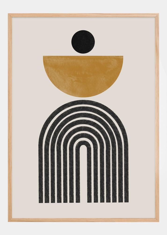 Tauchen Sie ein in eine Welt der Abstraktion und Symmetrie mit unserem modernen Poster, das eine Reihe von schwarz-weißen Bögen unter einem sonnenförmigen, goldfarbenen Halbkreis darstellt, gekrönt von einem schwarzen Kreis. Dieses Druckwerk ist eine Ode an die Klarheit der modernen Kunst und die Einfachheit des geometrischen Designs und verleiht Ihrer Einrichtung einen Hauch von Raffinesse. Die Farben sind kühn reduziert, um den Kontrast und das visuelle Gewicht jeder Form zu betonen.