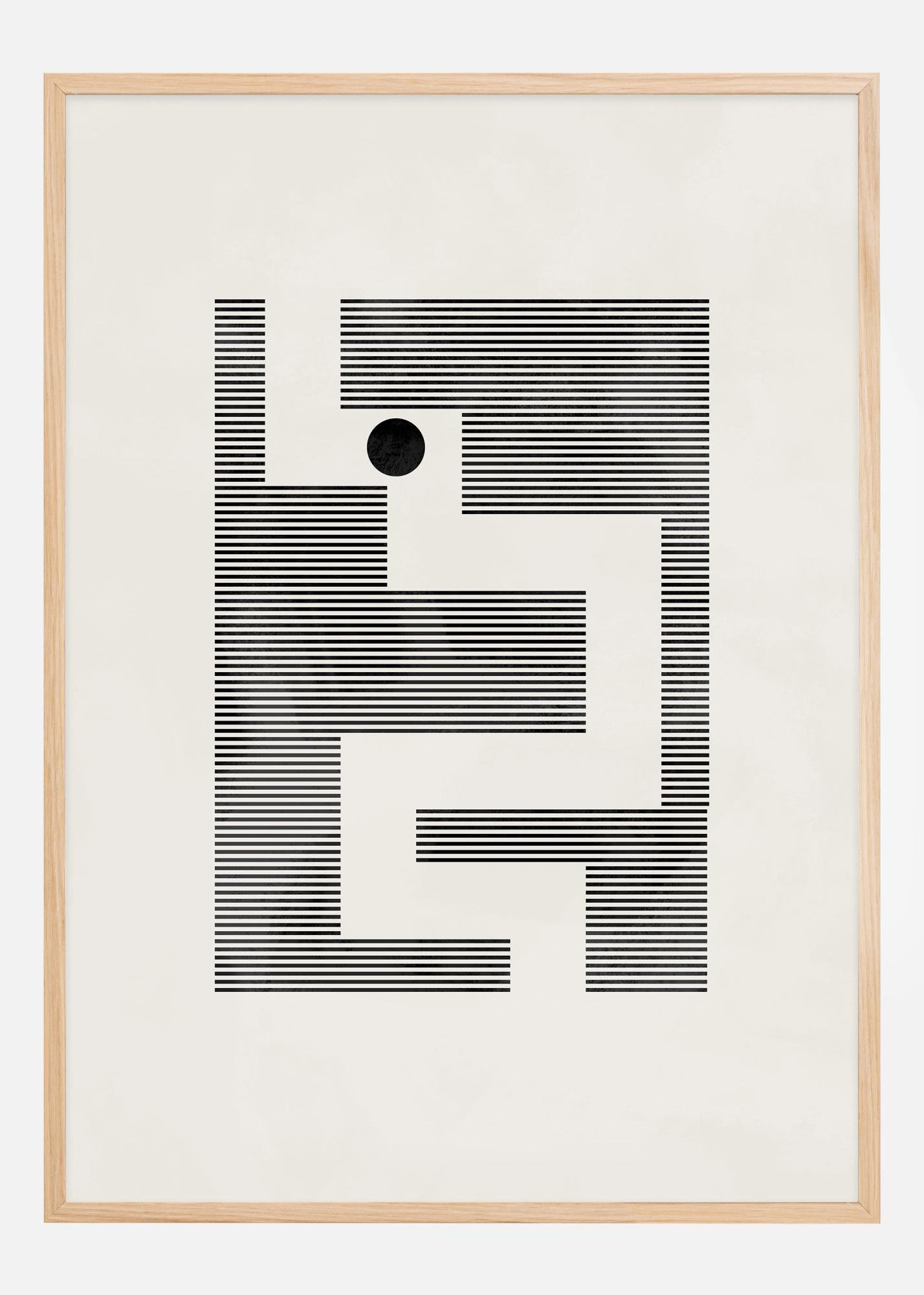 Dieses künstlerische Poster bietet eine minimalistische Interpretation eines Labyrinths, ausgeführt mit schwarzen Linien, die ein kompliziertes Geflecht aus geometrischen Formen vor einem cremefarbenen Hintergrund bilden. Der einzelne schwarze Kreis, der in der Mitte des Labyrinths platziert ist, dient als visuelles Ankerpunkt und verleiht dem ansonsten einfachen Motiv gleichzeitig Tiefe und Fokus. Dieses Design spielt mit dem Betrachterauge und ermutigt zu einer visuellen Erforschung seiner Wege und Sackgassen.