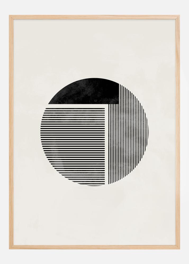 Dieses elegante und minimalistische Poster ist eine Studie in Kontrast und Einfachheit, die einen Halbkreis zeigt, der in Schwarz und Weiß mit gestreiften Mustern geteilt ist. Das abstrakte Motiv ist eine sorgfältig ausbalancierte Komposition aus geometrischen Formen und Linien, die einen sofortigen visuellen Effekt erzeugt. Dieses Kunstwerk ist eine Hommage an das Subtile und Anspruchsvolle und bietet eine zeitlose Ästhetik, die in jedes moderne Zuhause oder Büro passt.