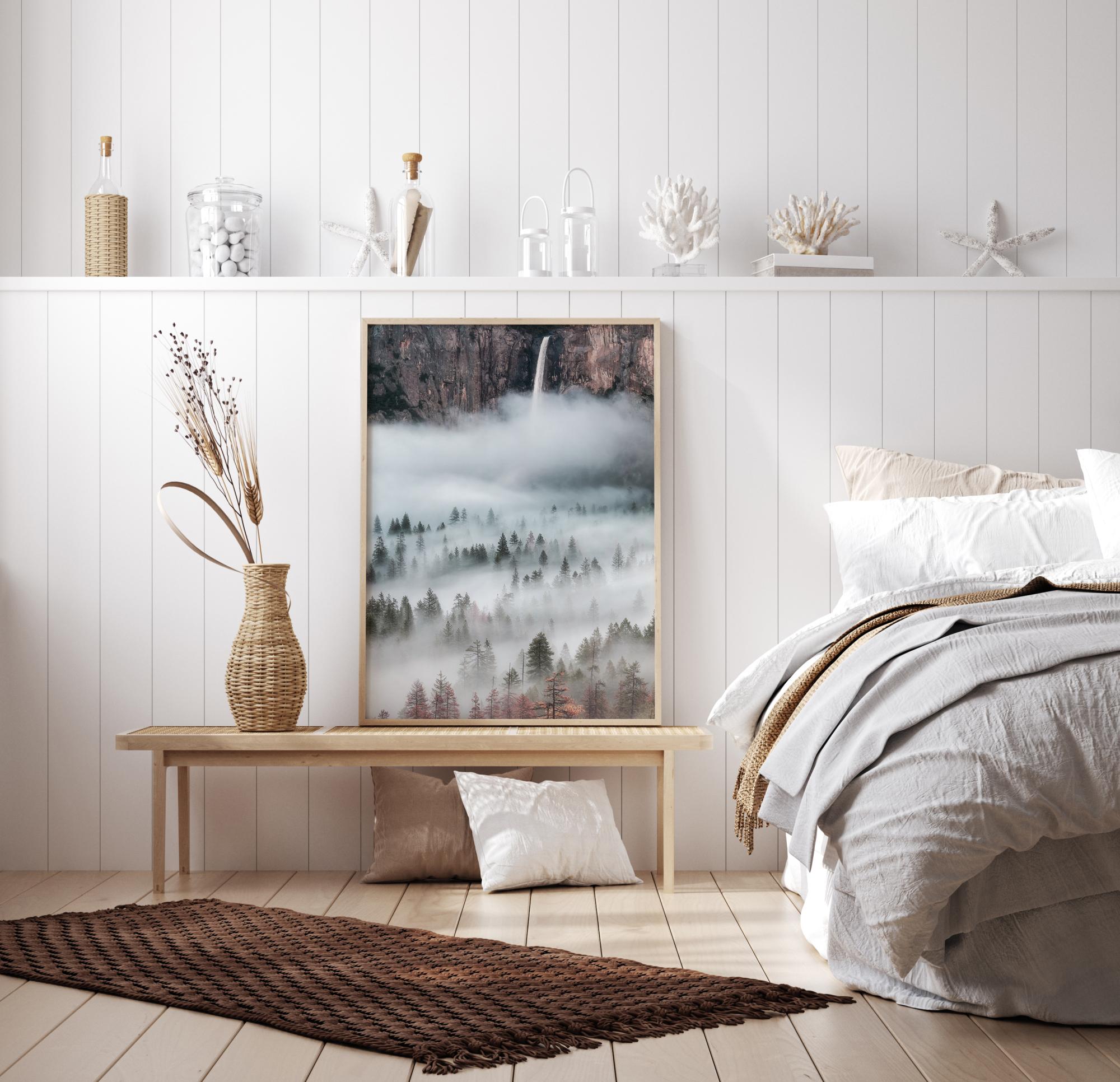 Ein wunderbares Foto eines nebligen Hügels mit einigen Felsen und einem spektakulären Wasserfall im Hintergrund. Der Nebel schwebt friedlich und bringt das Gefühl eines kühlen Morgens in Ihr Zuhause. Die wundervollen Herbstfarben und der schwebende Nebel vermitteln ein Gefühl von Geheimnis.