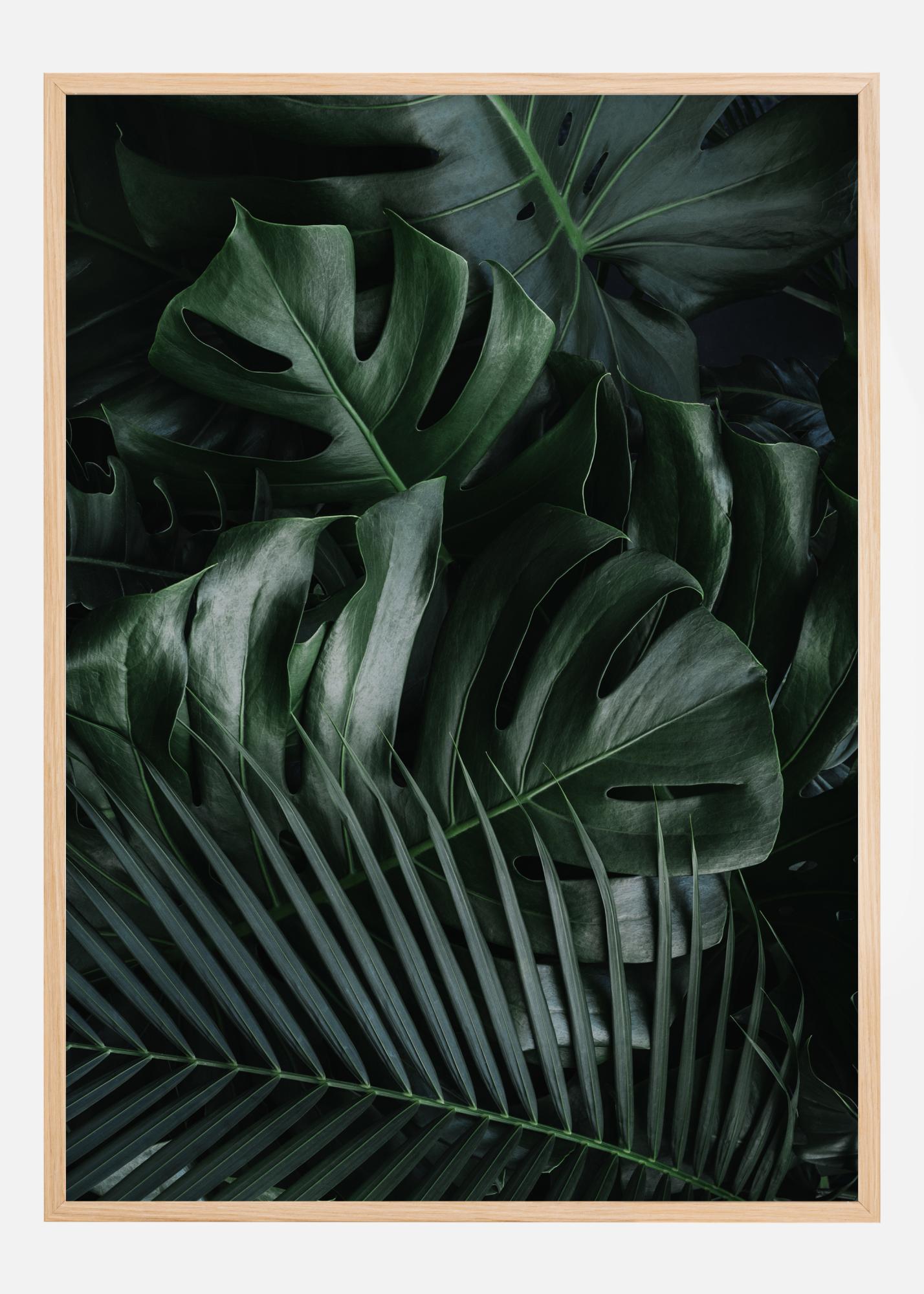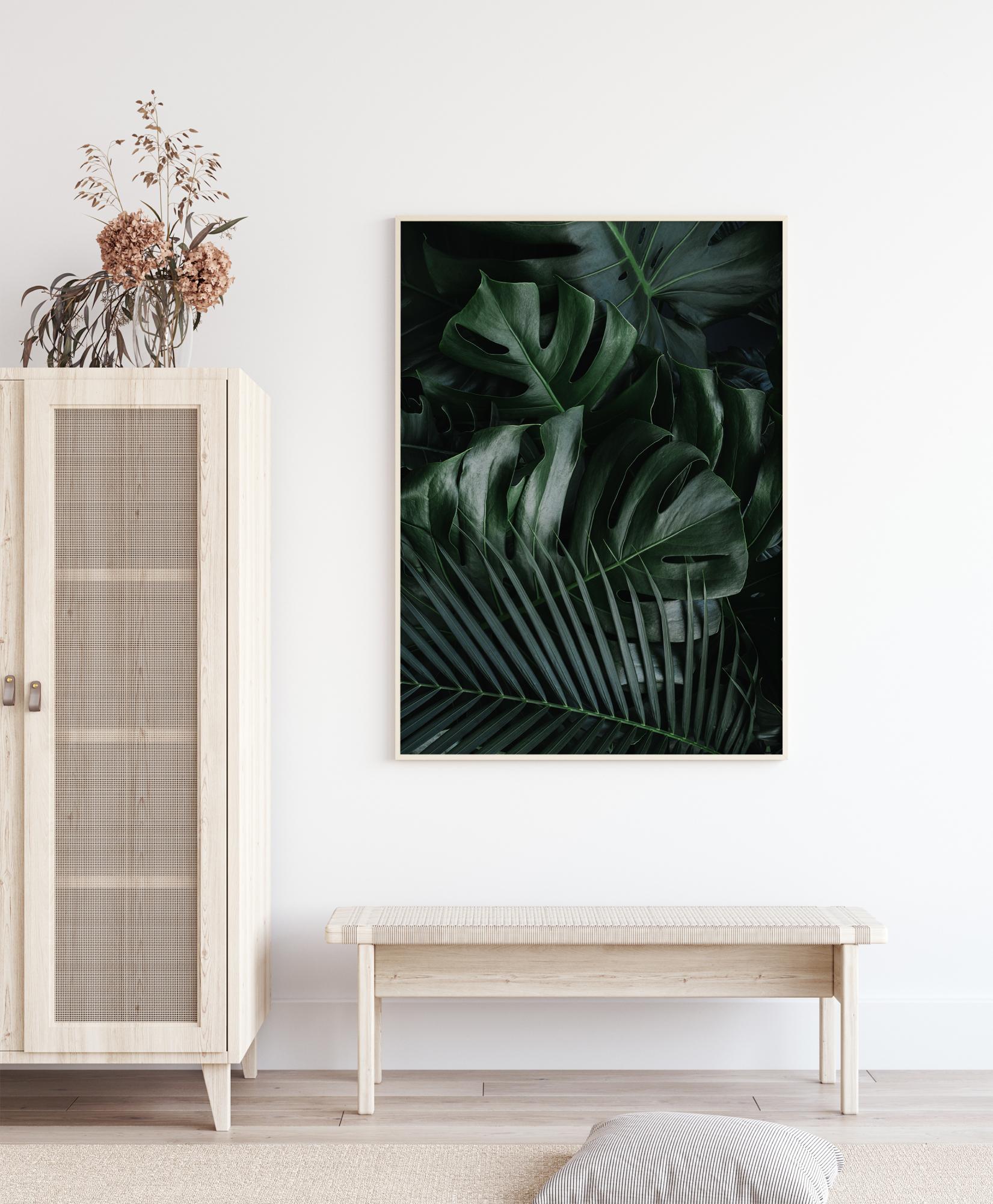 Ein blattreiches Porträt aus grünen Monstera- und Palmenblättern. Das natürliche Licht scheint auf den oberen Teil der Monstera-Blätter und erzeugt dunklere Schattierungen im oberen Teil des Bildes. Die ganzen sägeförmigen Blätter erzeugen ein warmes, entspannendes Gefühl. Ein perfekter Druck für jeden, der Pflanzen liebt.