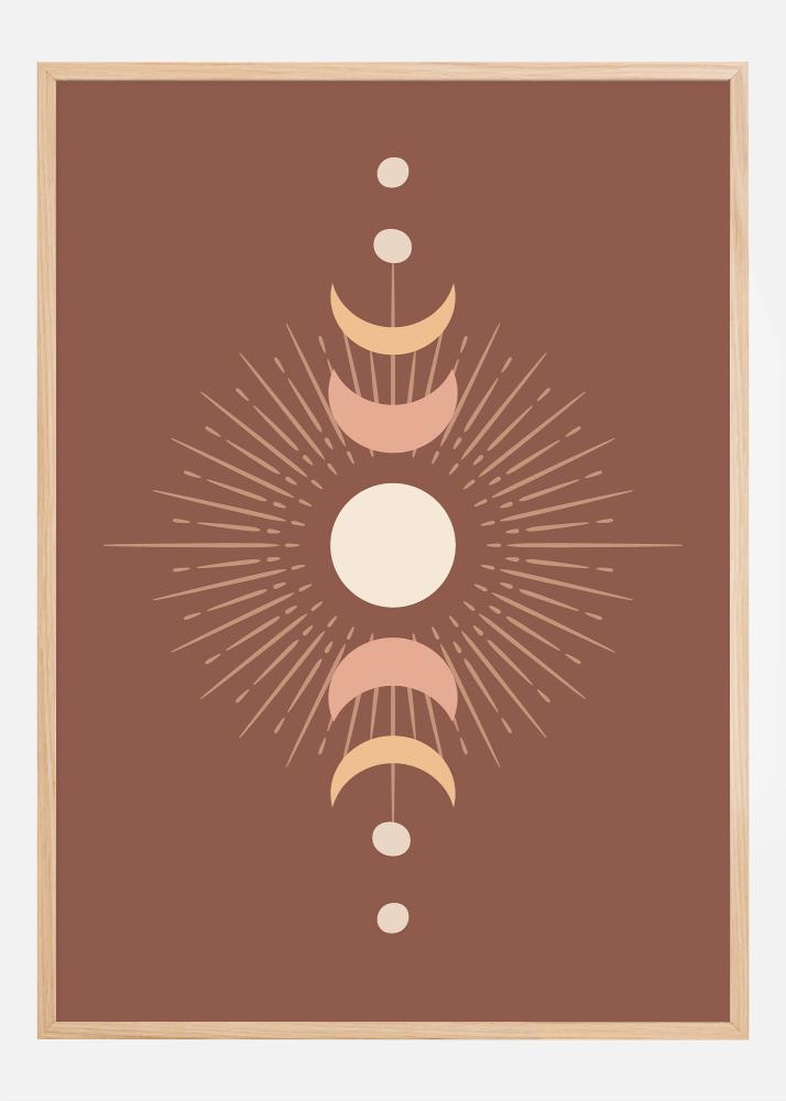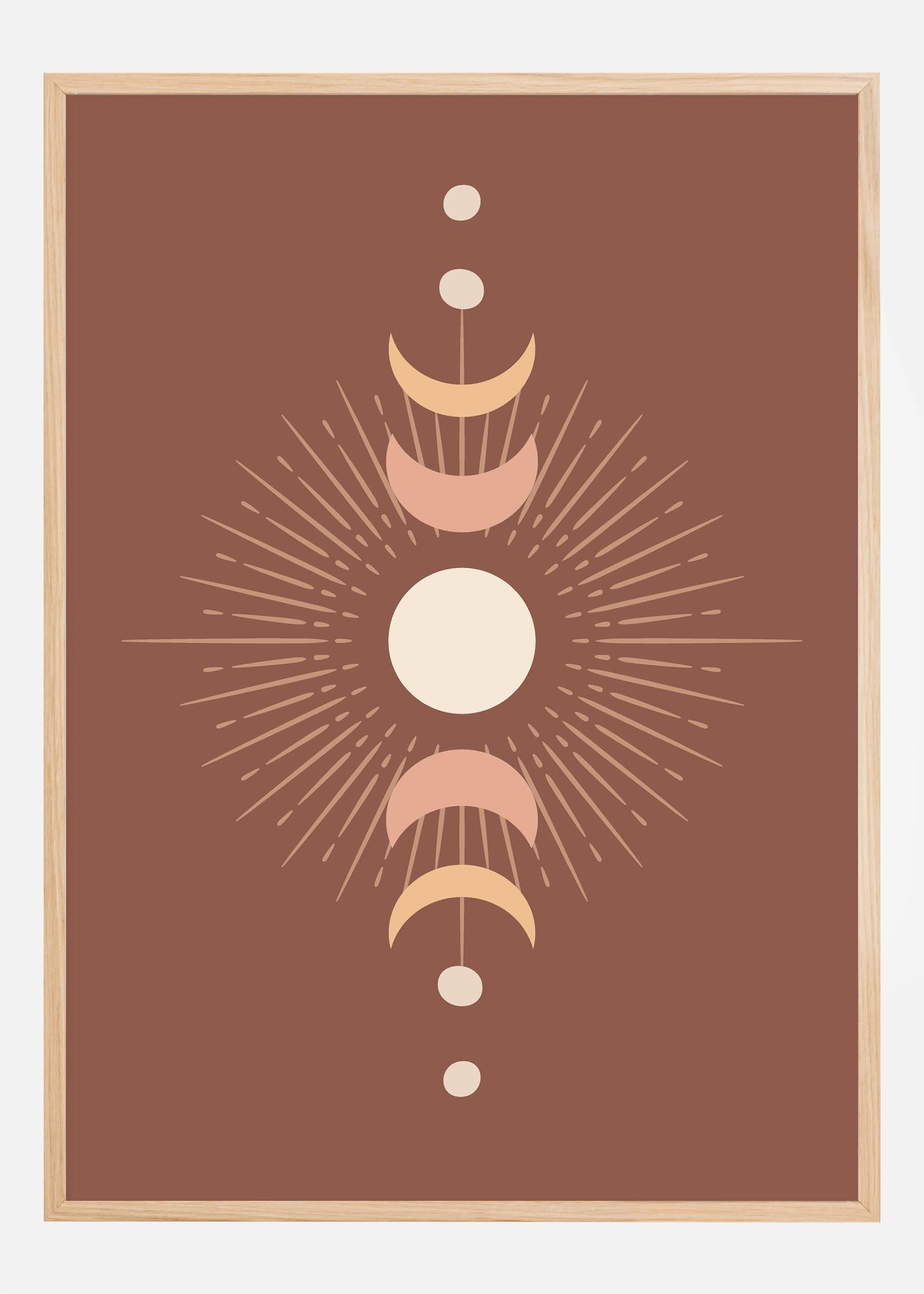 Dieses stilvolle Poster, das die verschiedenen Phasen des Mondes vor einem tiefgründigen und nachdenklichen Hintergrund darstellt, vermittelt ein Gefühl von kosmischer Harmonie und zeitloser Schönheit. Die sanft gezeichneten Mondphasen, zentral angeordnet mit der strahlenden Sonne darunter, sind eine Erinnerung an unseren Platz im größeren Zusammenhang des Universums. Ihre warme Farbgebung in Erdtönen schafft eine beruhigende und einladende Atmosphäre.