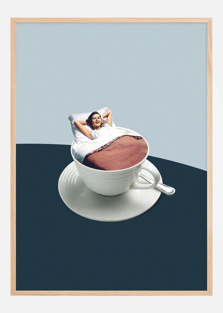 Dieses originelle und fantasievolle Poster porträtiert eine Frau, die scheinbar einen entspannten Moment in einer ungewöhnlichen Umgebung genießt: Sie liegt bequem in einer weißen Tasse, die mit Kaffee gefüllt ist, umgeben von einem beruhigenden blauen Raum, der den Anbruch eines neuen Tages andeutet. Die Größe der Tasse im Verhältnis zur Frau schafft ein surrealistisches Gefühl, und ihre entspannte Haltung in Bettwäsche fügt der Szene einen Hauch von Alltagskomfort und Humor hinzu.