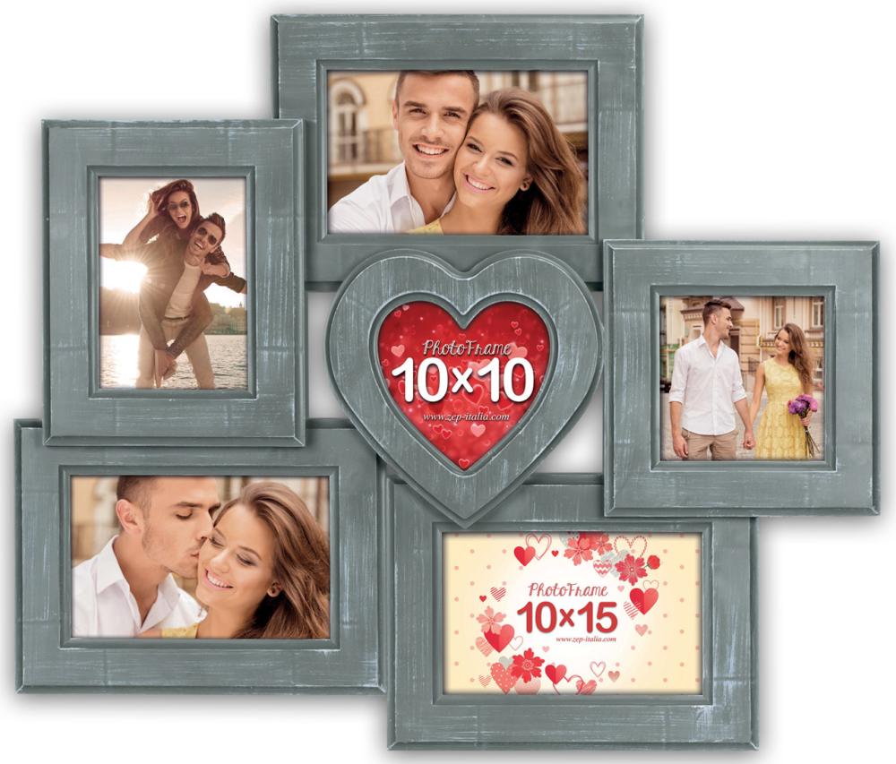 Ein toller Collage-Bilderrahmen mit romantischem Charakter. In der Mitte des Rahmens befindet sich ein herzförmiger Einzelrahmen, um das Motiv im Mittelpunkt stilgerecht einzurahmen. Umgeben ist der Bilderrahmen in Herzform von weiteren Bilderrahmen für Motive im Quer- als auch im Hochformat. Das Foto, das seinen Platz in der Mitte findet, macht zweifellos den unumstrittenen Blickpunkt der gesamten Bildercollage aus. Mit diesem stilsicheren, grauen Collagerahmen kannst du 6 Bilder in den Formaten 9x13 cm, 10x10 cm und 10x15 cm hübsch angeordnet einrahmen. Gefertigt ist der Collagerahmen aus Komposit. Der Bilderrahmen ist mit einer Wandhalterung versehen.