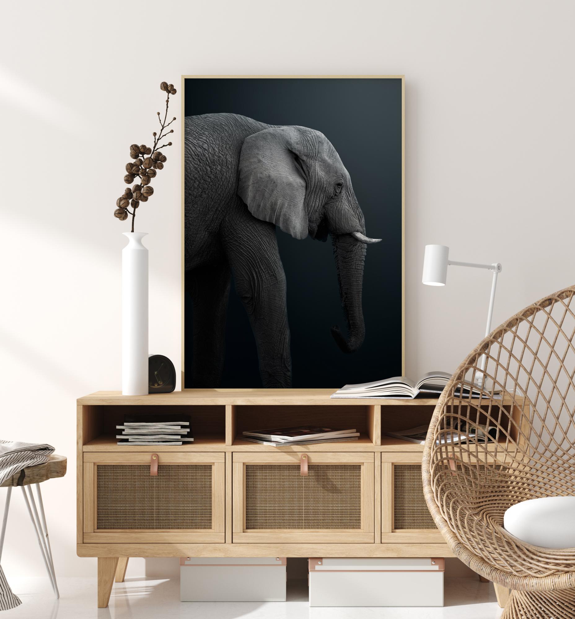 Ein bezauberndes Porträt eines gesunden namibischen Elefanten. Der graue Riese blickt nach rechts, sein Rüssel hängt herab. Der dunkelblaue Hintergrund erzeugt ein Gefühl der Traurigkeit, da der Elefant sehr einsam zu sein scheint. Ein schöner Druck für alle Liebhaber.